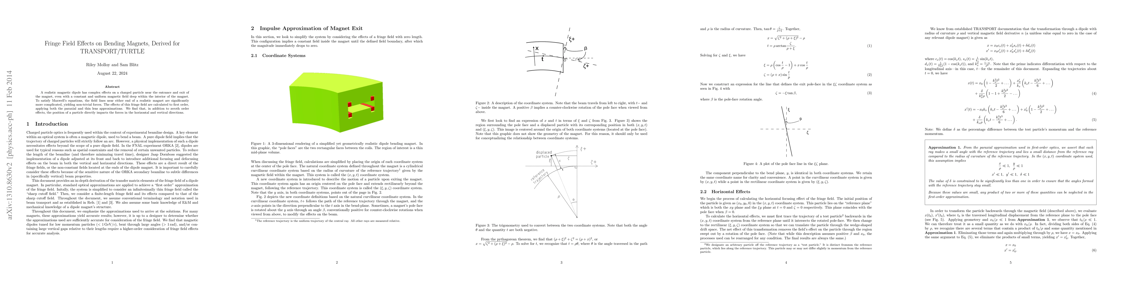 This research calculates fringe field effects on bending magnets using paraxial and thin lens approximations. It finds that particle position impacts horizontal and vertical forces due to complex field line behavior near magnet ends.