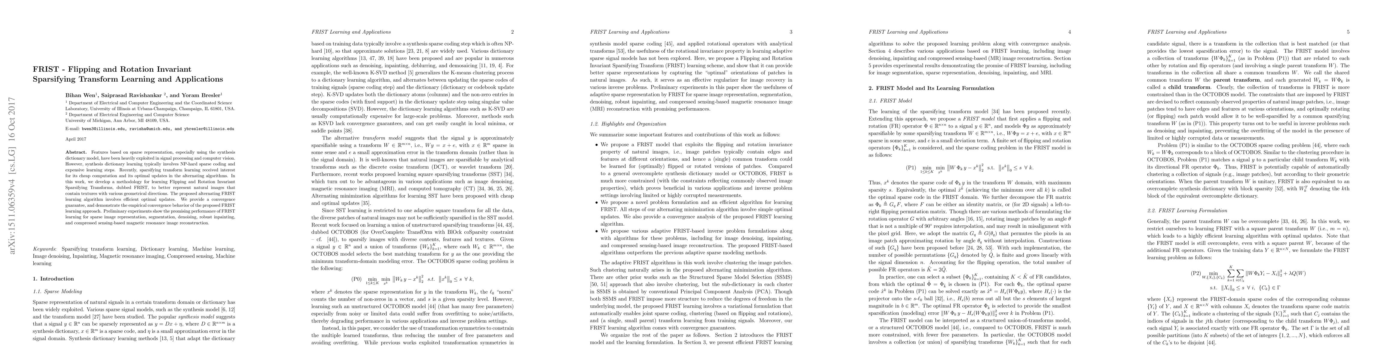 This paper introduces FRIST, a Flipping and Rotation Invariant Sparsifying Transform learning method, designed to efficiently represent natural images with diverse textures. The proposed algorithm offers optimal updates and demonstrates promising performance in applications like image segmentation, denoising, and magnetic resonance imaging reconstruction.