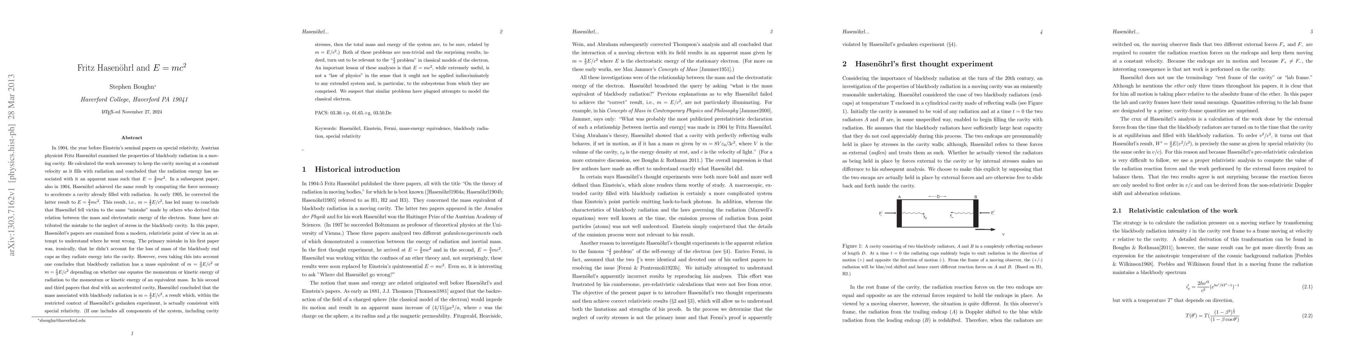 Fritz Hasenohrl in 1904 derived the mass-energy relation E = 3/8 mc^2 for a moving cavity filled with blackbody radiation, later correcting it to E = 3/4 mc^2. Modern analysis reveals that his errors stemmed from not accounting for the blackbody end caps' mass loss, but his results align with special relativity within the context of his thought experiments.