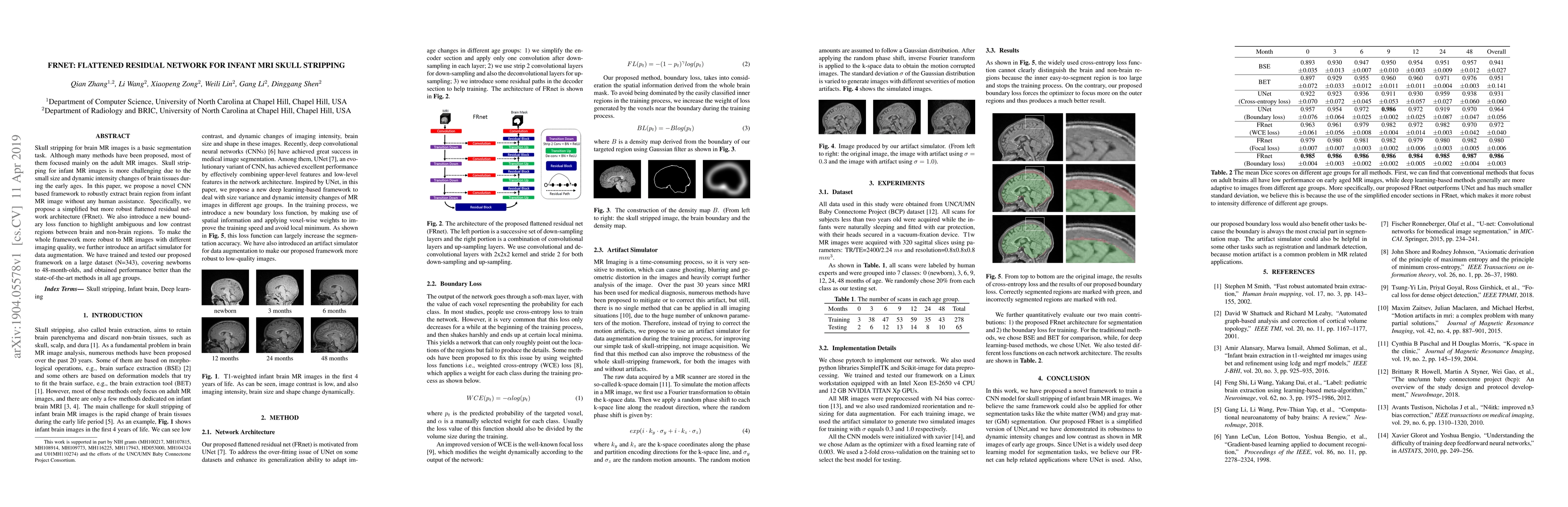 This paper proposes a CNN-based framework called FRNET for skull stripping in infant MRI images, featuring a simplified residual network (FRnet) and a new boundary loss function. The method is robust to varying image quality and achieves superior performance compared to existing methods on a large dataset of infant MRIs.
