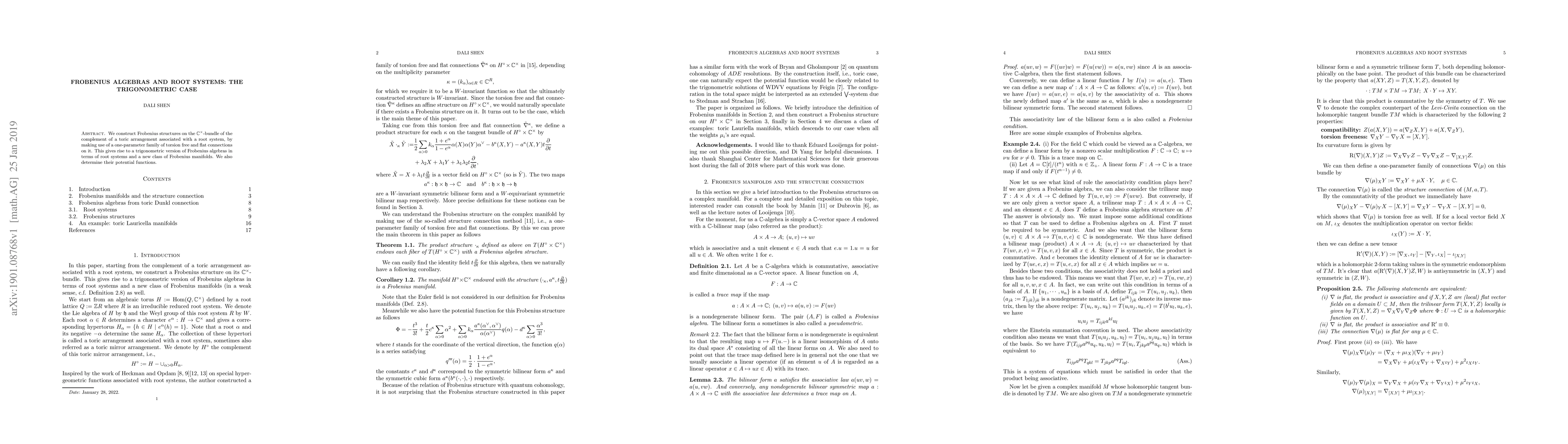 Researchers construct Frobenius structures on a bundle of the complement of a toric arrangement associated with a root system, leading to a new class of Frobenius manifolds and trigonometric versions of Frobenius algebras.