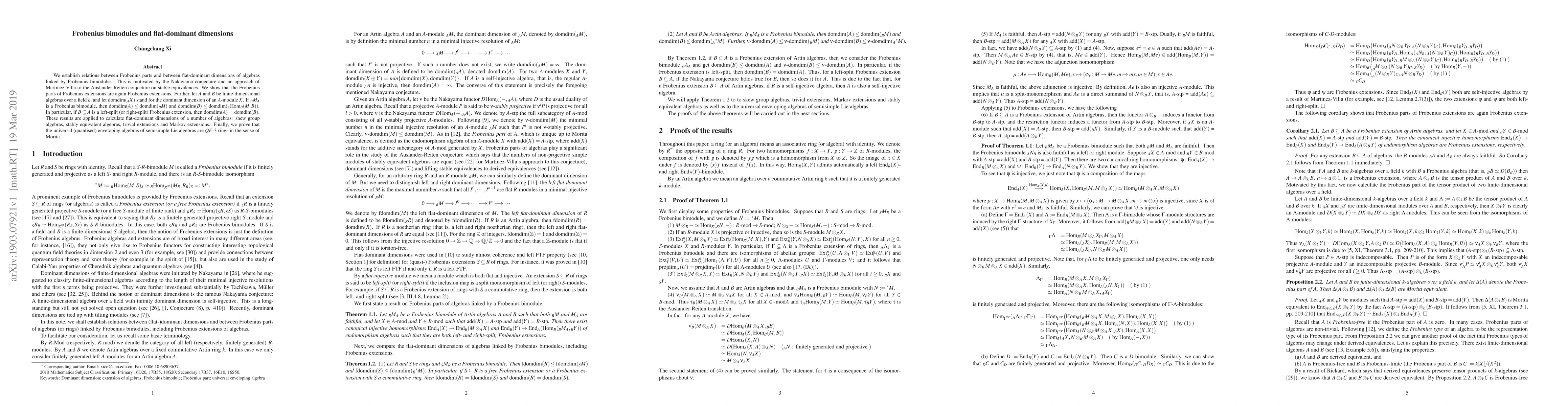 We establish relations between Frobenius parts and between flat-dominant dimensions of algebras linked by Frobenius bimodules. This is motivated by the Nakayama conjecture and an approach of Martinez-Villa to the Auslander-Reiten conjecture on stable equivalences. We show that the Frobenius parts of Frobenius extensions are again Frobenius extensions. Further, let $A$ and $B$ be finite-dimensional algebras over a field $k$, and let $\dm(_AX)$ stand for the dominant dimension of an $A$-module $X$. If $_BM_A$ is a Frobenius bimodule, then $\dm(A)\le \dm(_BM)$ and $\dm(B)\le \dm(_A\Hom_B(M, B))$. In particular, if $B\subseteq A$ is a left-split (or right-split) Frobenius extension, then $\dm(A)=\dm(B)$. These results are applied to calculate flat-dominant dimensions of a number of algebras: shew group algebras, stably equivalent algebras, trivial extensions and Markov extensions. Finally, we prove that the universal (quantised) enveloping algebras of semisimple Lie algebras are $QF$-$3$ rings in the sense of Morita.