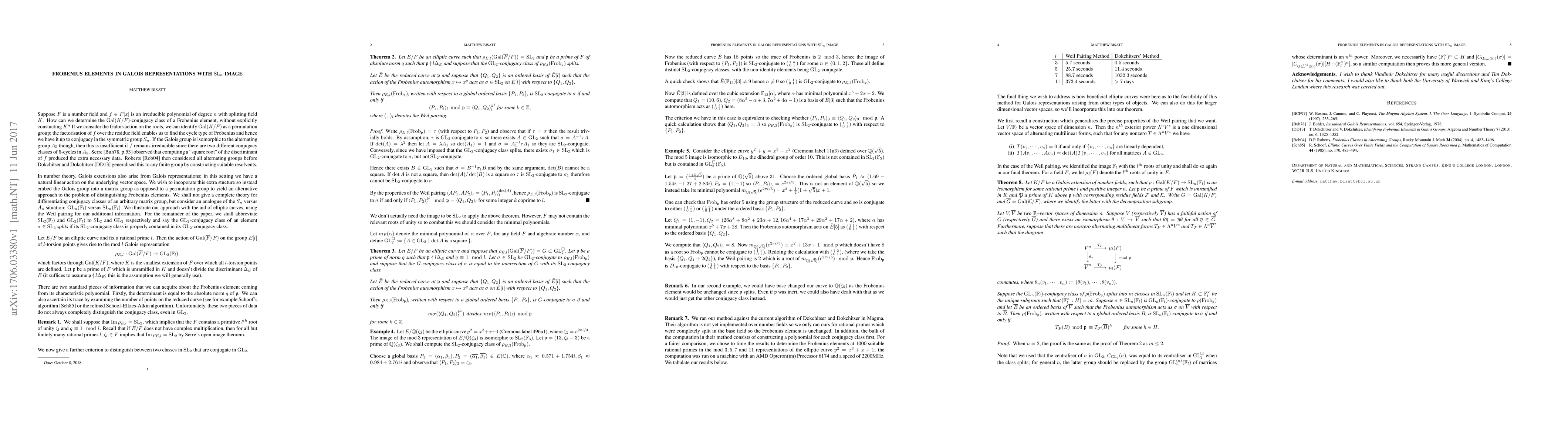 This paper develops a method to determine Frobenius elements in Galois representations associated with elliptic curves over number fields, focusing on cases where the mod $l$ representation has an image isomorphic to $SL_2(\mathbb{F}_l)$. It distinguishes $SL_n(\mathbb{F}_l)$-conjugacy from $GL_n(\mathbb{F}_l)$-conjugacy, analogous to distinguishing $A_n$-conjugacy from $S_n$-conjugacy in permutation groups.