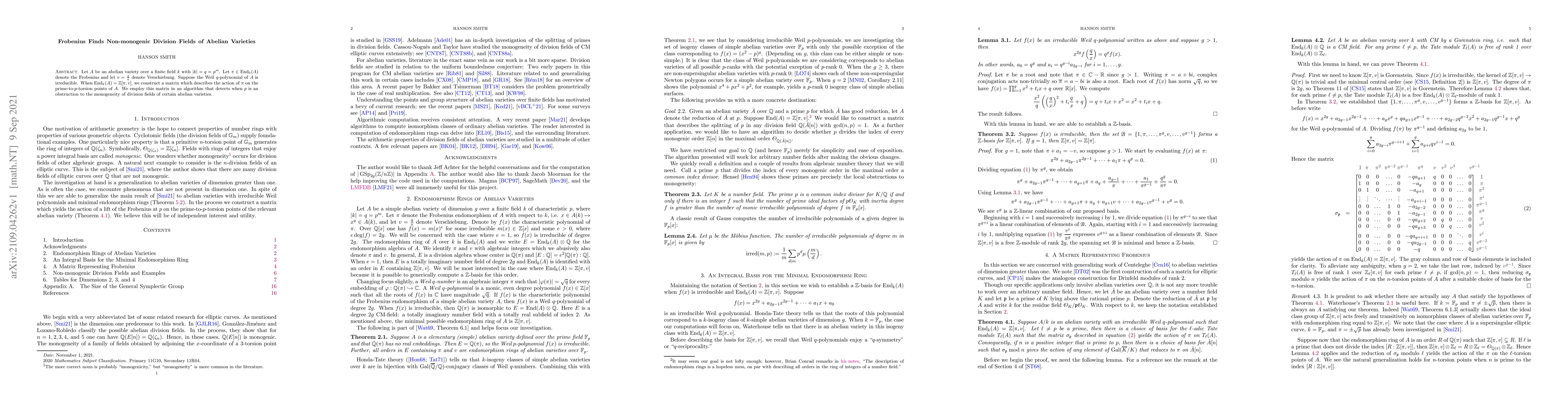 This paper constructs a matrix to describe the action of the Frobenius endomorphism on the torsion points of an abelian variety over a finite field, and uses this to develop an algorithm that identifies cases where the prime $p$ hinders the monogeneity of division fields of these varieties.