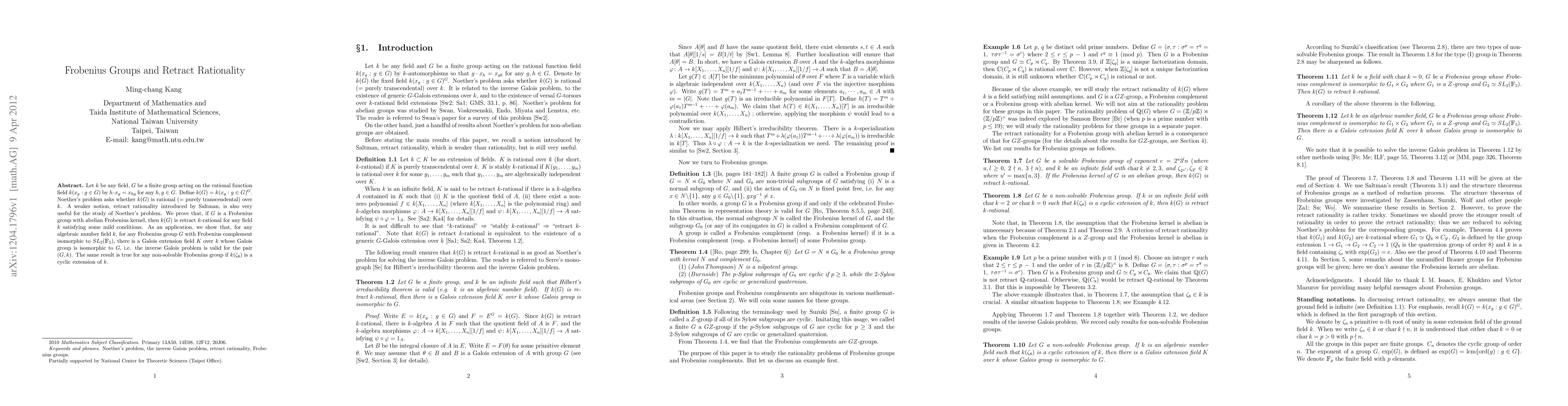 This paper proves that for a Frobenius group $G$ with an abelian Frobenius kernel, the field $k(G)$ is retract $k$-rational over any field $k$ under certain conditions. It also demonstrates the validity of the inverse Galois problem for specific Frobenius groups and algebraic number fields.