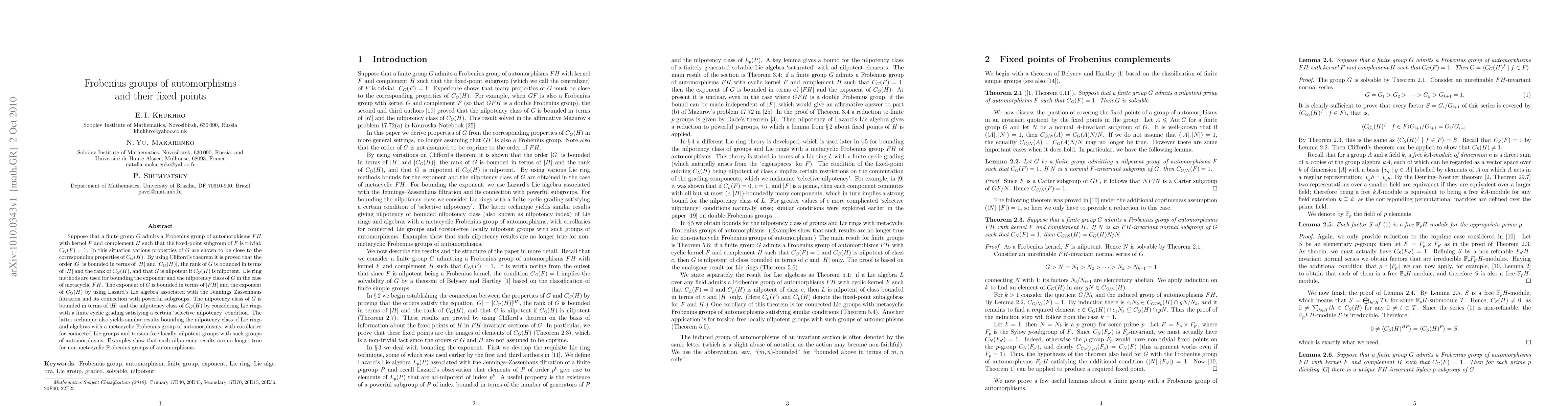 Suppose that a finite group $G$ admits a Frobenius group of automorphisms $FH$ with kernel $F$ and complement $H$ such that the fixed-point subgroup of $F$ is trivial: $C_G(F)=1$. In this situation various properties of $G$ are shown to be close to the corresponding properties of $C_G(H)$. By using Clifford's theorem it is proved that the order $|G|$ is bounded in terms of $|H|$ and $|C_G(H)|$, the rank of $G$ is bounded in terms of $|H|$ and the rank of $C_G(H)$, and that $G$ is nilpotent if $C_G(H)$ is nilpotent. Lie ring methods are used for bounding the exponent and the nilpotency class of $G$ in the case of metacyclic $FH$. The exponent of $G$ is bounded in terms of $|FH|$ and the exponent of $C_G(H)$ by using Lazard's Lie algebra associated with the Jennings--Zassenhaus filtration and its connection with powerful subgroups. The nilpotency class of $G$ is bounded in terms of $|H|$ and the nilpotency class of $C_G(H)$ by considering Lie rings with a finite cyclic grading satisfying a certain `selective nilpotency' condition. The latter technique also yields similar results bounding the nilpotency class of Lie rings and algebras with a metacyclic Frobenius group of automorphisms, with corollaries for connected Lie groups and torsion-free locally nilpotent groups with such groups of automorphisms. Examples show that such nilpotency results are no longer true for non-metacyclic Frobenius groups of automorphisms.