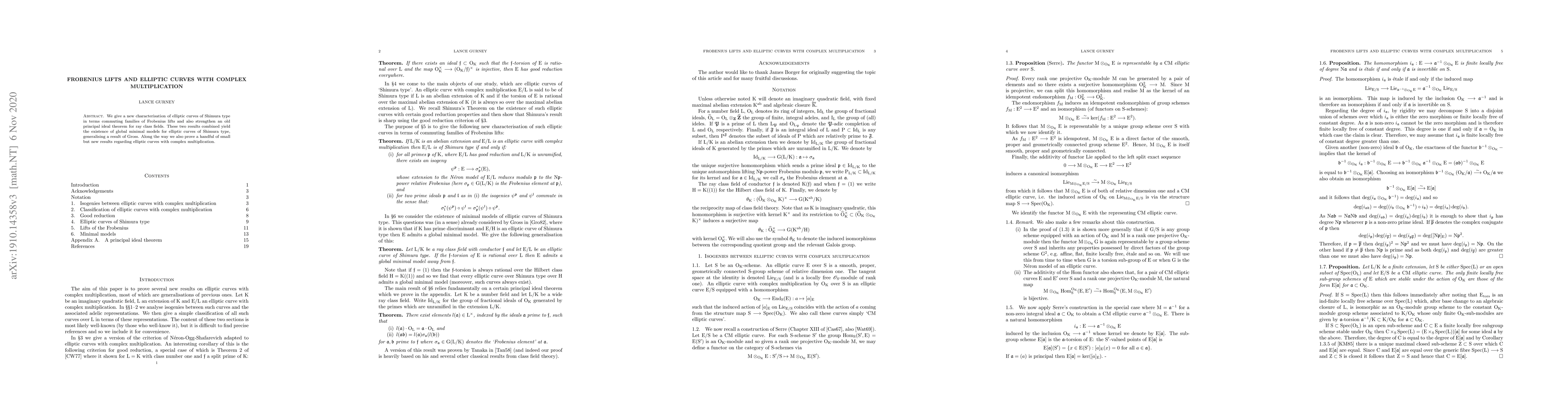 We give a new characterisation of elliptic curves of Shimura type in terms commuting families of Frobenius lifts and also strengthen an old principal ideal theorem for ray class fields. These two results combined yield the existence of global minimal models for elliptic curves of Shimura type, generalising a result of Gross. Along the way we also prove a handful of small but new results regarding elliptic curves with complex multiplication.