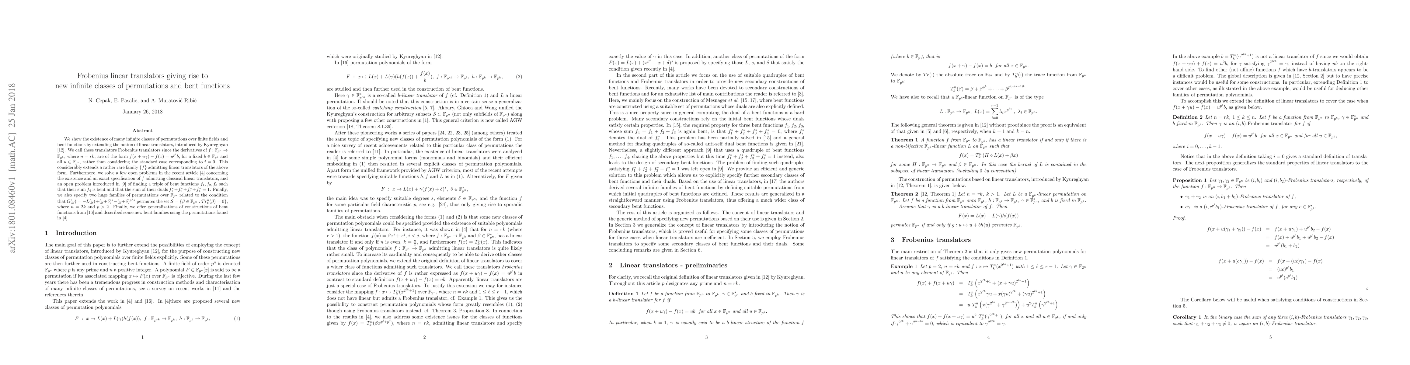 We show the existence of many infinite classes of permutations over finite fields and bent functions by extending the notion of linear translators, introduced by Kyureghyan [12]. We call these translators Frobenius translators since the derivatives of $f : F_{p^n} \rightarrow F_{p^k}$, where $n = rk$, are of the form $f(x + u\phi) - f(x) = u^{p^i}b$, for a fixed $b \in F_{p^k}$ and all $u \in F_{p^k}$, rather than considering the standard case corresponding to $i = 0$. This considerably extends a rather rare family {f} admitting linear translators of the above form. Furthermore, we solve a few open problems in the recent article [4] concerning the existence and an exact specification of $f$ admitting classical linear translators, and an open problem introduced in [9] of finding a triple of bent functions $f_1, f_2, f_3$ such that their sum $f_4$ is bent and that the sum of their duals $f_1* +f_2* +f_3* +f_4* = 1$. Finally, we also specify two huge families of permutations over $F_{p^n}$ related to the condition that $G(y) = -L(y)+(y+\delta)^s -(y+\delta)^{p^ks}$ permutes the set $S =\{\beta \in F_{p^n} : Tr^n_k(\beta) = 0\}$, where $n = 2k$ and $p > 2$. Finally, we offer generalizations of constructions of bent functions from [16] and described some new bent families using the permutations found in [4].