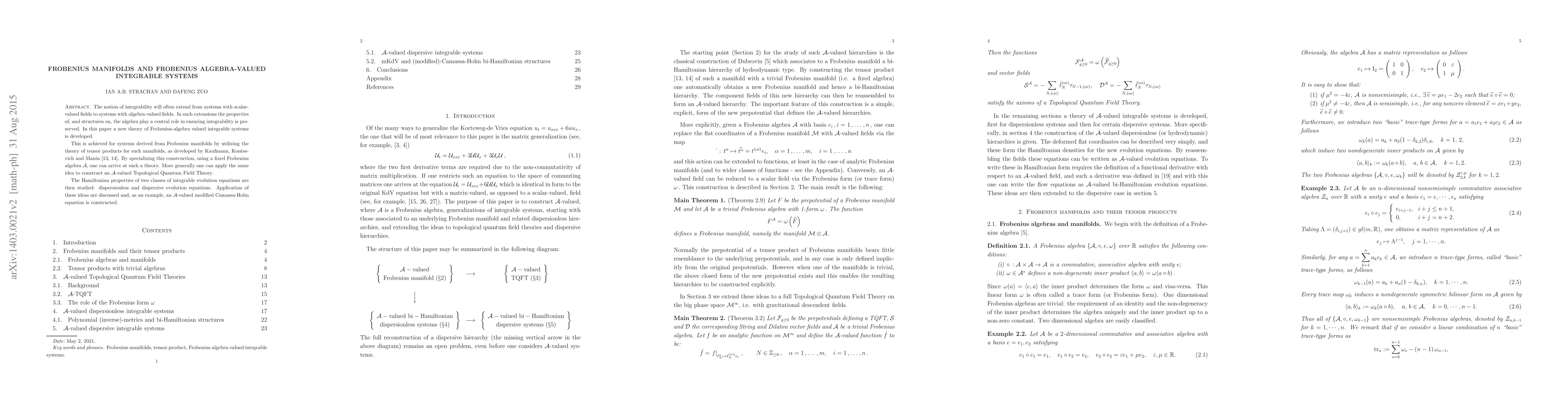 This paper develops a new theory for Frobenius-algebra valued integrable systems derived from Frobenius manifolds, utilizing tensor product theory. It constructs an $\mathcal{A}$-valued Topological Quantum Field Theory and studies Hamiltonian properties of dispersionless and dispersive evolution equations, exemplified by an $\mathcal{A}$-valued modified Camassa-Holm equation.