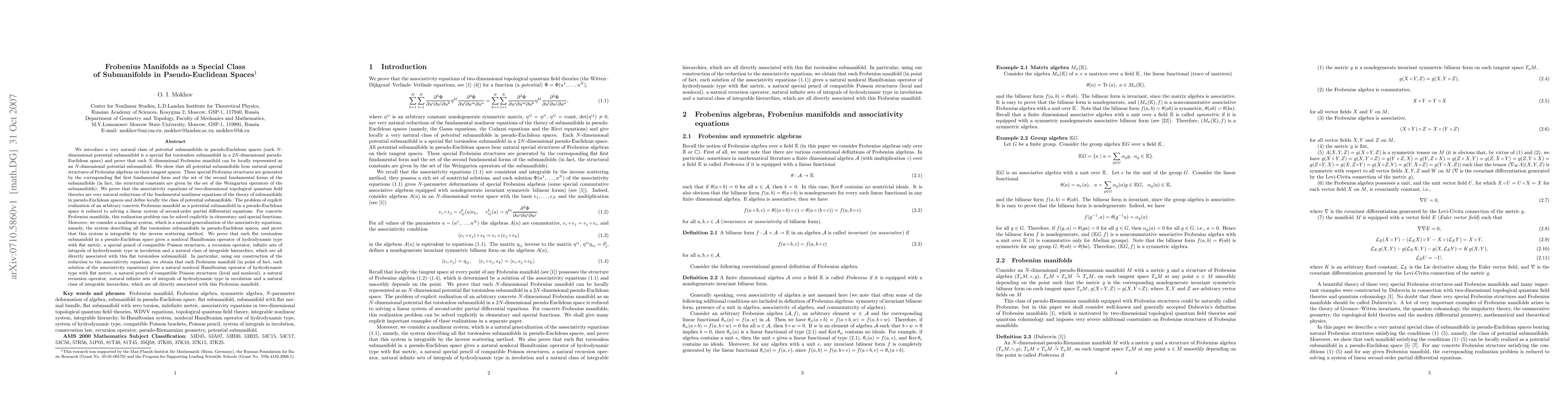 We introduce a class of potential submanifolds in pseudo-Euclidean spaces (each N-dimensional potential submanifold is a special flat torsionless submanifold in a 2N-dimensional pseudo-Euclidean space) and prove that each N-dimensional Frobenius manifold can be locally represented as an N-dimensional potential submanifold. We show that all potential submanifolds bear natural special structures of Frobenius algebras on their tangent spaces. These special Frobenius structures are generated by the corresponding flat first fundamental form and the set of the second fundamental forms of the submanifolds (in fact, the structural constants are given by the set of the Weingarten operators of the submanifolds). We prove that the associativity equations of two-dimensional topological quantum field theories are very natural reductions of the fundamental nonlinear equations of the theory of submanifolds in pseudo-Euclidean spaces and define locally the class of potential submanifolds. The problem of explicit realization of an arbitrary concrete Frobenius manifold as a potential submanifold in a pseudo-Euclidean space is reduced to solving a linear system of second-order partial differential equations. For concrete Frobenius manifolds, this realization problem can be solved explicitly in elementary and special functions.