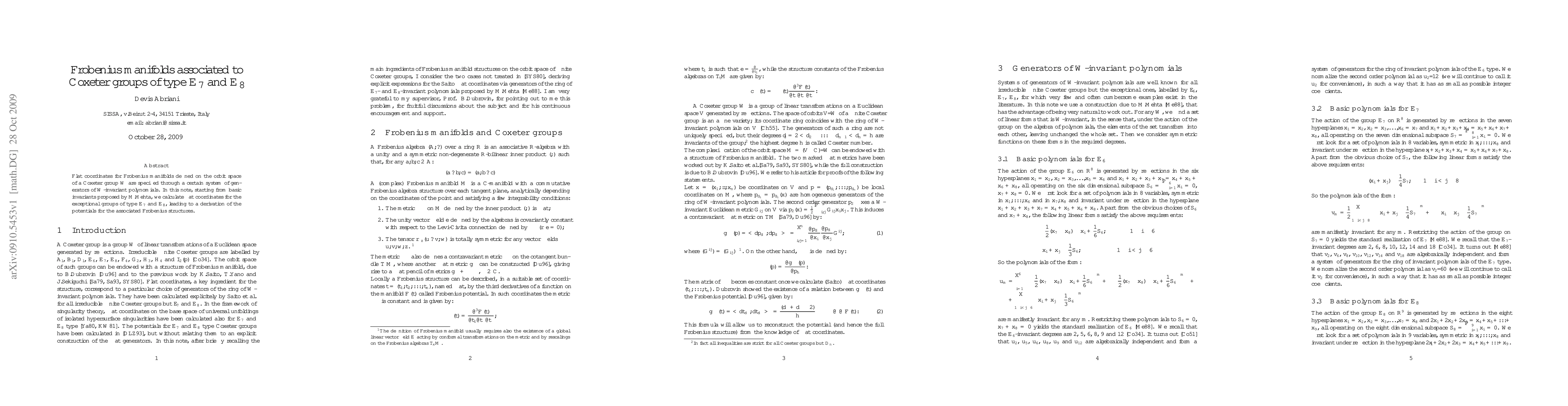 This paper derives flat coordinates for Frobenius manifolds associated with Coxeter groups of type E_7 and E_8, using W-invariant polynomial generators, and computes the corresponding potentials for the Frobenius structures based on invariants proposed by M.Mehta.