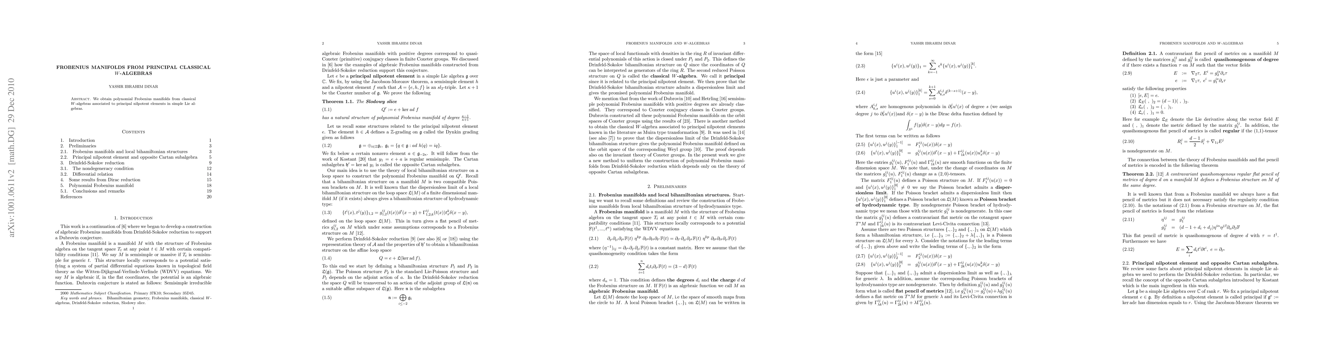Summary: This paper constructs polynomial Frobenius manifolds from classical $W$-algebras linked to regular nilpotent elements in simple Lie algebras via opposite Cartan subalgebras. The findings provide a new perspective on the structure of these algebraic objects.