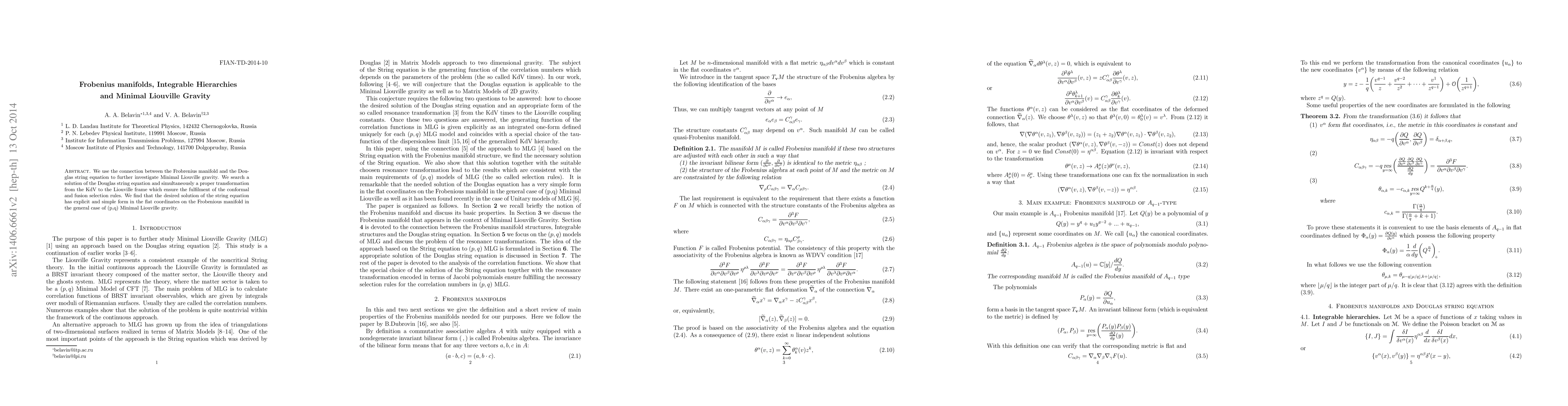 This paper explores the relationship between Frobenius manifolds and the Douglas string equation to investigate Minimal Liouville gravity, finding a simple solution in flat coordinates on the Frobenius manifold that satisfies conformal and fusion selection rules.