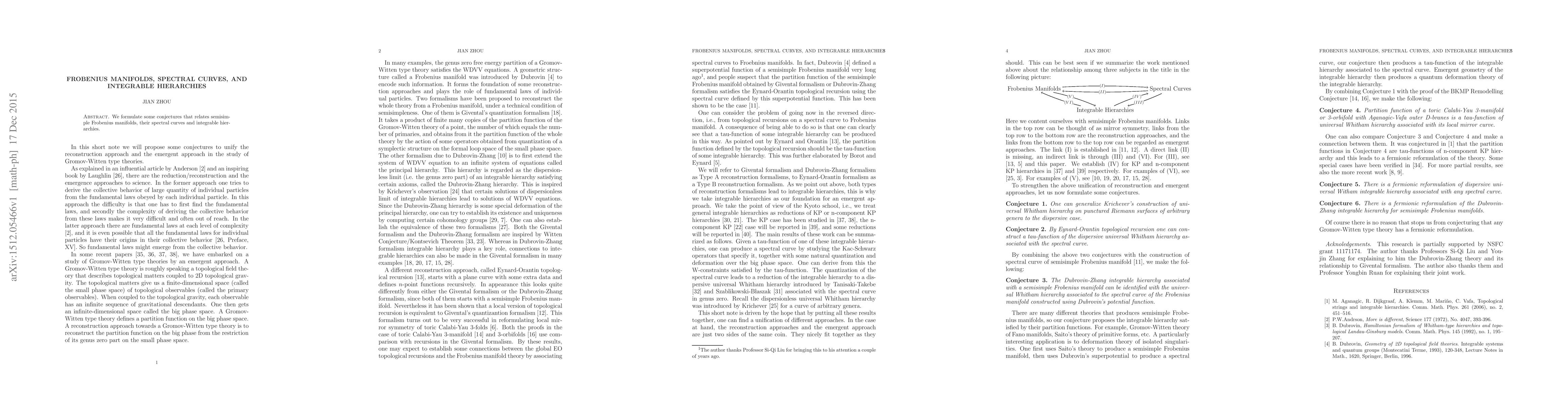Summary: This paper proposes conjectures linking semisimple Frobenius manifolds, their associated spectral curves, and integrable hierarchies, aiming to uncover deeper connections between these mathematical structures.
