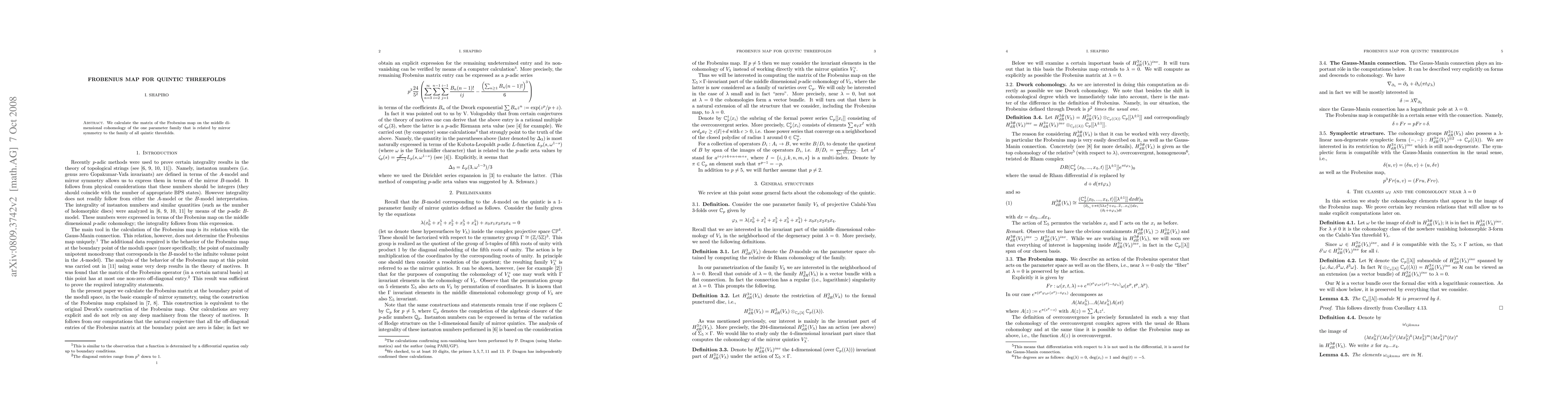 Summary: This paper computes the Frobenius map matrix acting on the middle cohomology of a one-parameter family linked by mirror symmetry to quintic threefolds, providing insights into their cohomological structure.
