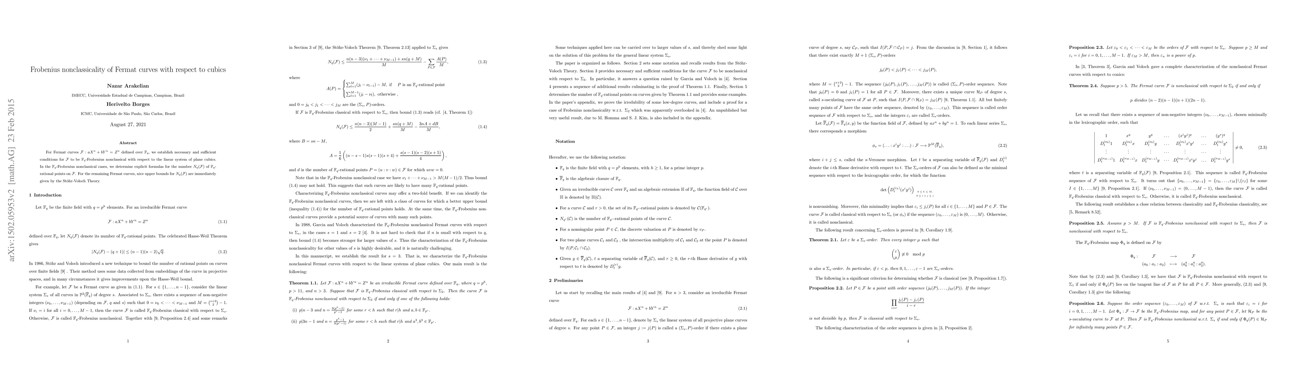 For Fermat curves $\mathcal{F}:aX^n+bY^n=Z^n$ defined over $\mathbb{F}_q$, we establish necessary and sufficient conditions for $\mathcal{F}$ to be $\mathbb{F}_q$-Frobenius nonclassical with respect to the linear system of plane cubics. In the $\mathbb{F}_q$-Frobenius nonclassical cases, we determine explicit formulas for the number $N_q(\mathcal{F})$ of $\mathbb{F}_q$-rational points on $\mathcal{F}$. For the remaining Fermat curves, nice upper bounds for $N_q(\mathcal{F})$ are immediately given by the St\"ohr-Voloch Theory.