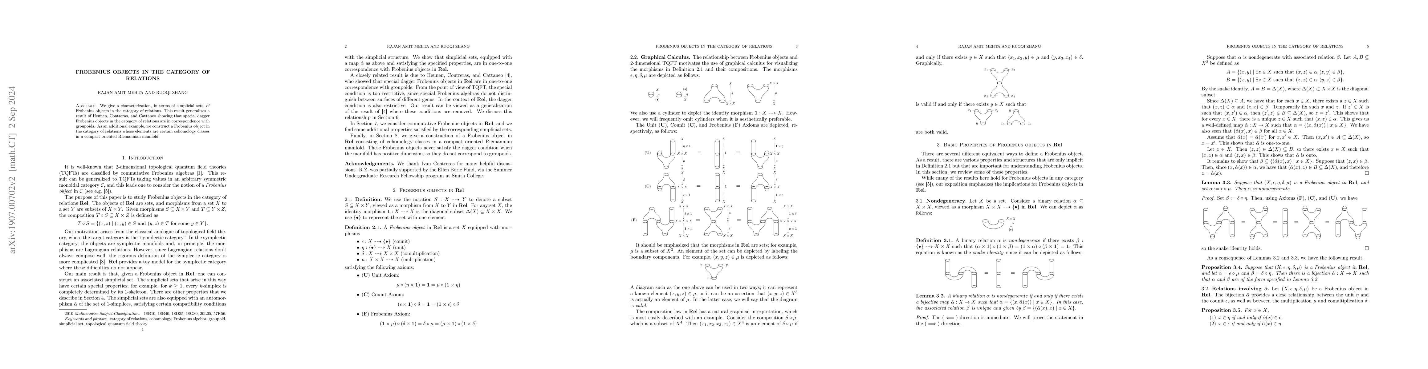 This paper characterizes Frobenius objects in the category of relations using simplicial sets, extending prior work that linked special dagger Frobenius objects with groupoids, and provides an example involving cohomology classes in compact Riemannian manifolds.
