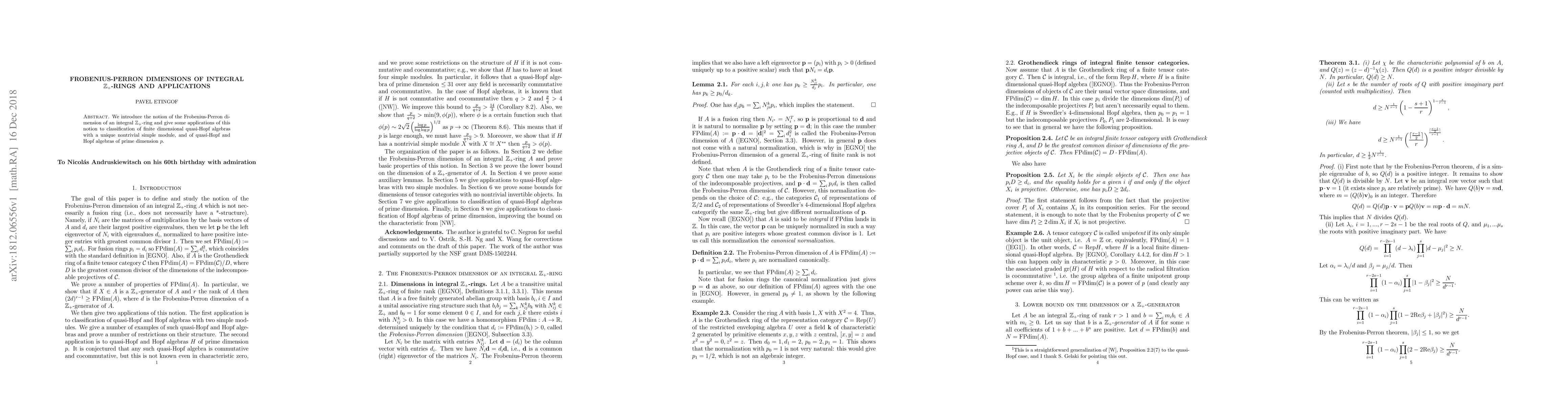 We introduce the notion of the Frobenius-Perron dimension of an integral $\Bbb Z_+$-ring and give some applications of this notion to classification of finite dimensional quasi-Hopf algebras with a unique nontrivial simple module, and of quasi-Hopf and Hopf algebras of prime dimension $p$.