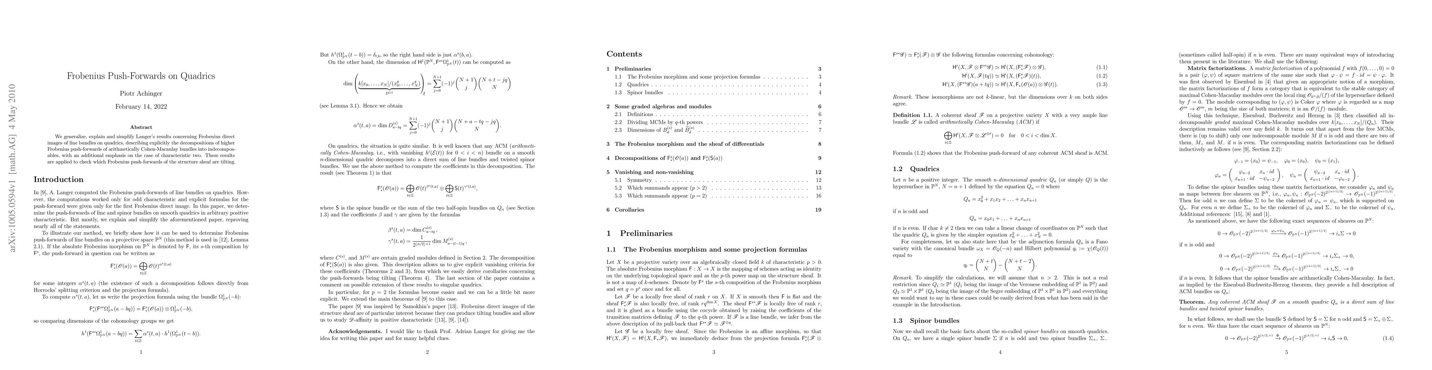 This paper generalizes Langer's findings on the Frobenius direct images of line bundles on quadrics, providing explicit decompositions of higher Frobenius push-forwards of arithmetically Cohen-Macaulay bundles, particularly in characteristic two, and applies these results to determine which Frobenius push-forwards of the structure sheaf are tilting.
