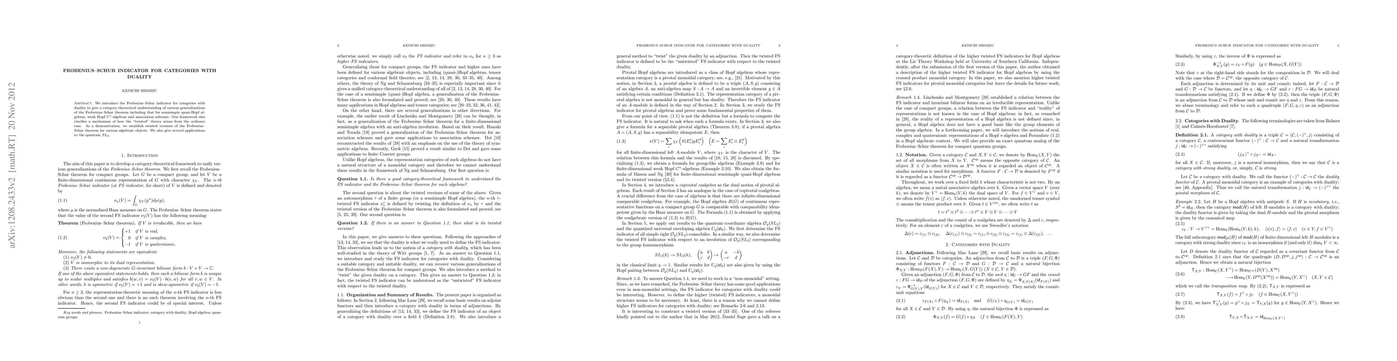 This paper introduces the Frobenius-Schur indicator for categories with duality, providing a category-theoretical framework for understanding various generalizations of the Frobenius-Schur theorem, including those for semisimple quasi-Hopf algebras and weak Hopf C*-algebras. It demonstrates a twisted Frobenius-Schur theorem for semisimple quasi-Hopf algebras and applies the theory to quantum SL_2.