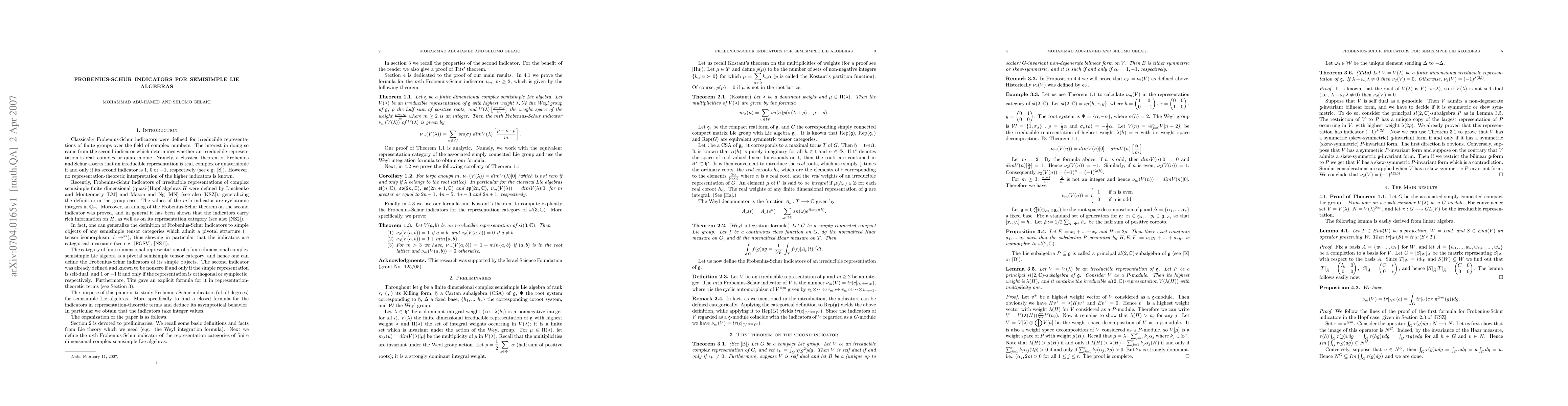 Let g be a finite dimensional complex semisimple Lie algebra, and let V be a finite dimensional represenation of g. We give a closed formula for the mth Frobenius-Schur indicator, m>1, of V in representation-theoretic terms. We deduce that the indicators take integer values, and that for a large enough m, the mth indicator of V equals the dimension of the zero weight space of V. For the classical Lie algebras sl(n), so(2n), so(2n+1) and sp(2n), this is the case for m greater or equal to 2n-1, 4n-5, 4n-3 and 2n+1, respectively.