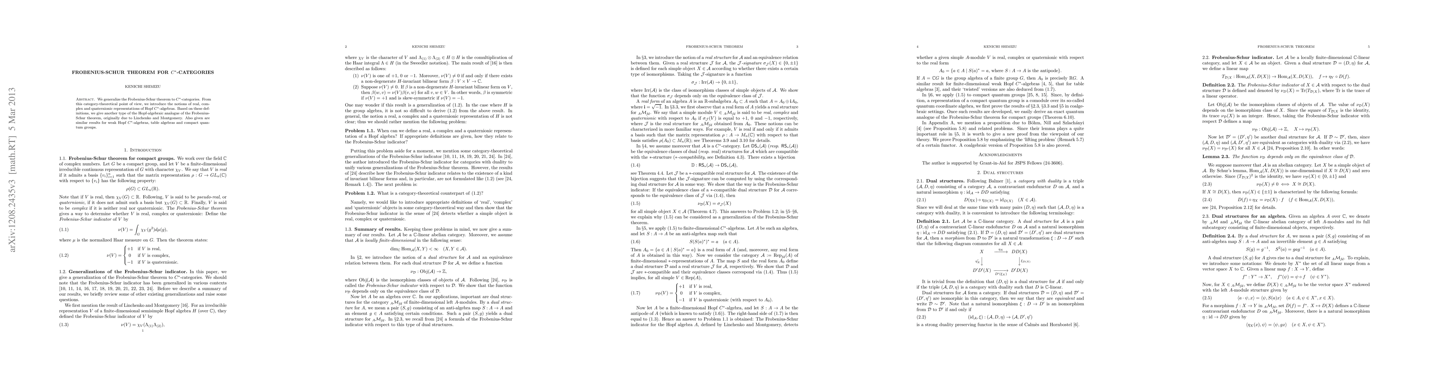 This paper generalizes the Frobenius-Schur theorem to $C^*$-categories, introducing real, complex, and quaternionic representations of Hopf $C^*$-algebras. It provides a Hopf-algebraic analogue of the theorem and extends similar results to weak Hopf $C^*$-algebras, table algebras, and compact quantum groups.
