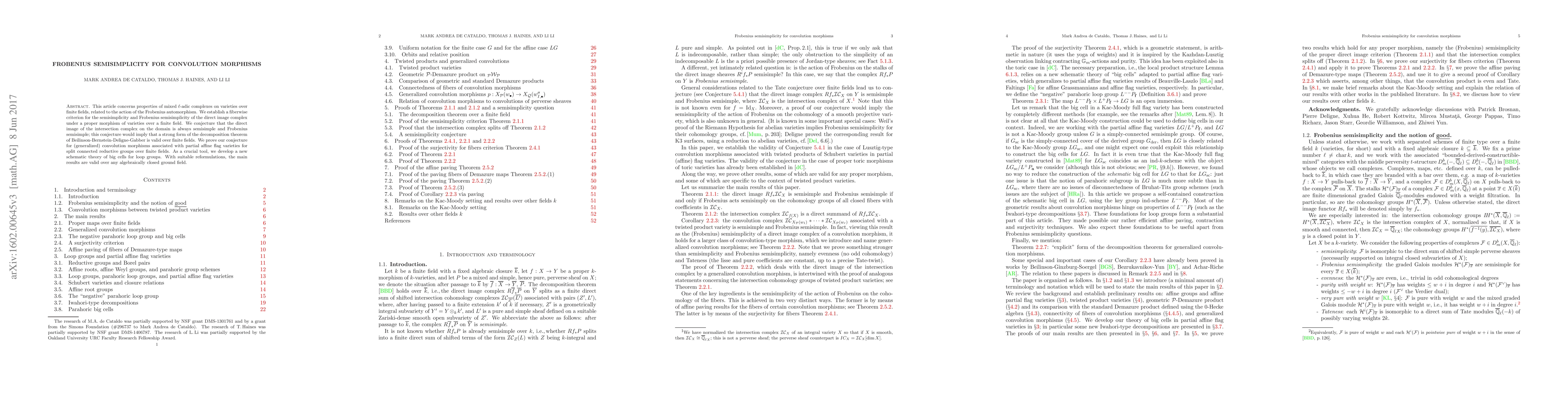 This paper establishes a criterion for semisimplicity and Frobenius semisimplicity of direct image complexes under proper morphisms over finite fields, proving conjectures for convolution morphisms related to partial affine flag varieties. The results are shown through two distinct proofs, one using affine space paving and another employing a new schematic theory of "big cells."