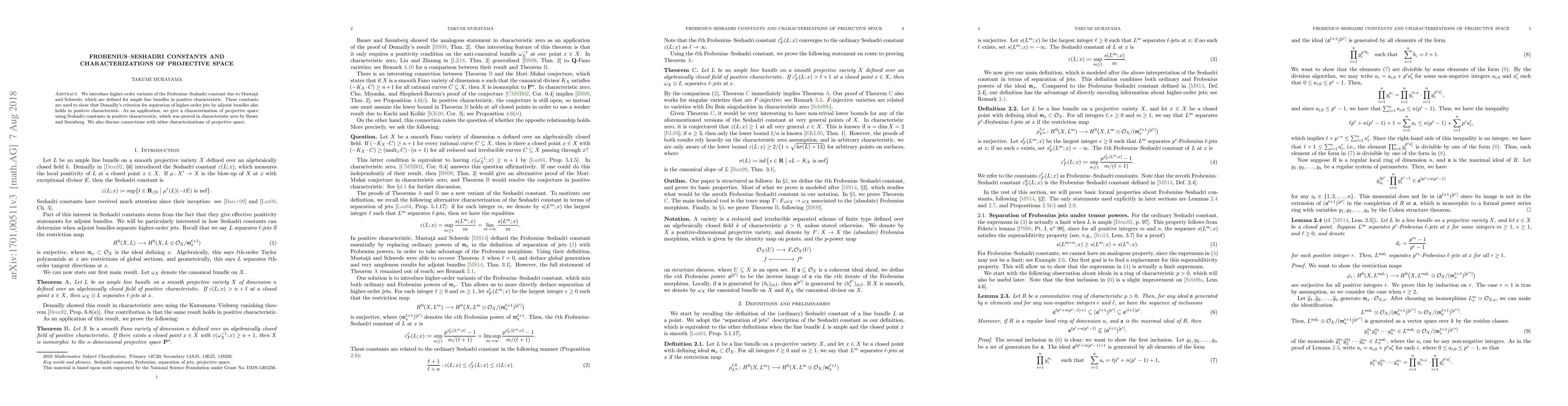 This research introduces higher-order Frobenius-Seshadri constants for ample line bundles in positive characteristic, extending Demailly's criterion for jet separation to this context. It characterizes projective space using these constants in positive characteristic, mirroring a known result from characteristic zero, and explores related characterizations of projective space.