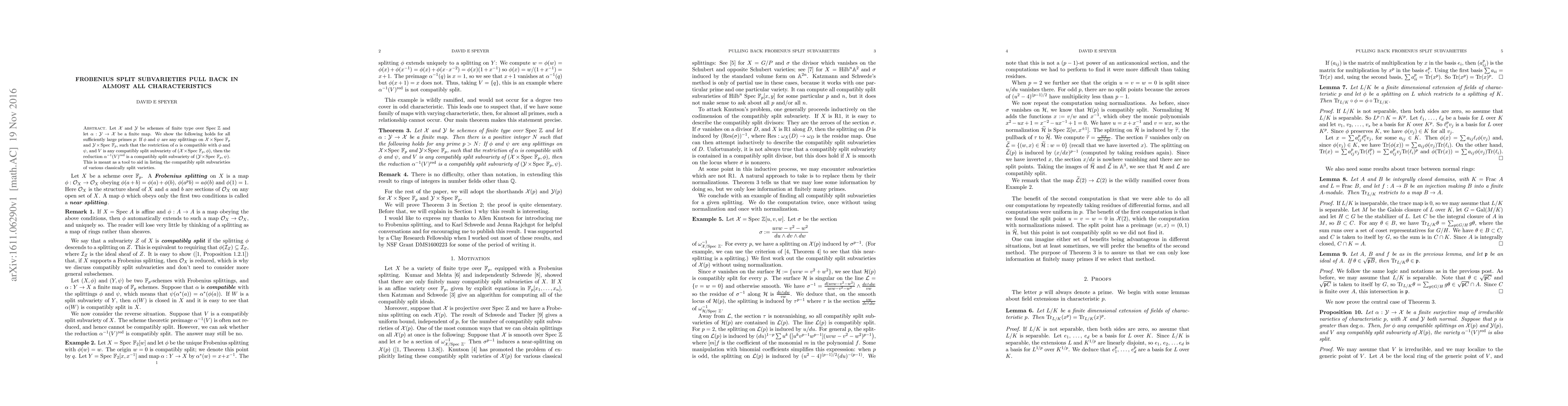 This paper demonstrates that compatibly split subvarieties of a scheme $X$ over $\mathbb{Z}$ pull back via a finite map $\alpha$ to compatibly split subvarieties in $Y$ for sufficiently large primes $p$. This result aids in identifying compatibly split subvarieties of classically split varieties.