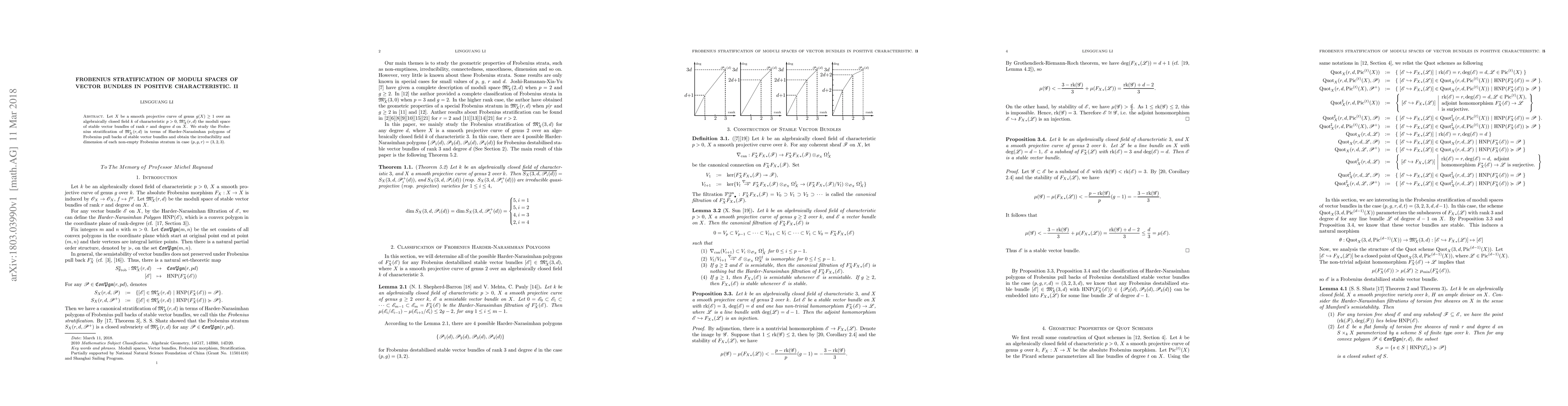 Let $X$ be a smooth projective curve of genus $g(X)\geq 1$ over an algebraically closed field $k$ of characteristic $p>0$, $\M^s_X(r,d)$ the moduli space of stable vector bundles of rank $r$ and degree $d$ on $X$. We study the Frobenius stratification of $\M^s_X(r,d)$ in terms of Harder-Narasimhan polygons of Frobenius pull backs of stable vector bundles and obtain the irreducibility and dimension of each non-empty Frobenius stratum in case $(p,g,r)=(3,2,3)$.
