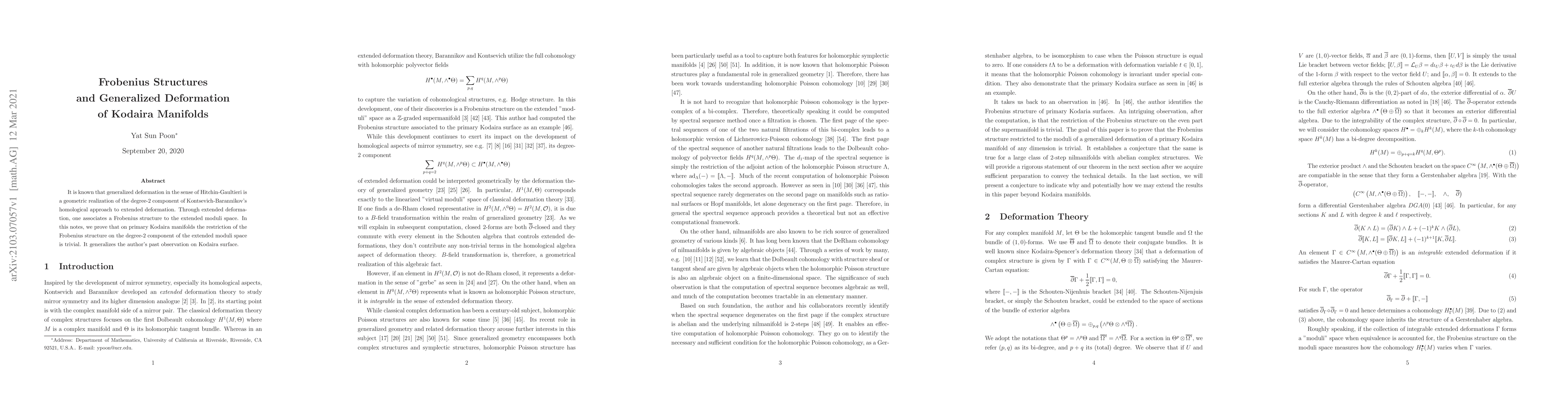 It is known that generalized deformation in the sense of Hitchin-Gaultieri is a geometric realization of the degree-2 component of Kontsevich-Barannikov's homological approach to extended deformation. Through extended deformation, one associates a Frobenius structure to the extended moduli space. In this notes, we prove that on primary Kodaira manifolds the restriction of the Frobenius structure on the degree-2 component of the extended moduli space is trivial. It generalizes the author's past observation on Kodaira surface.