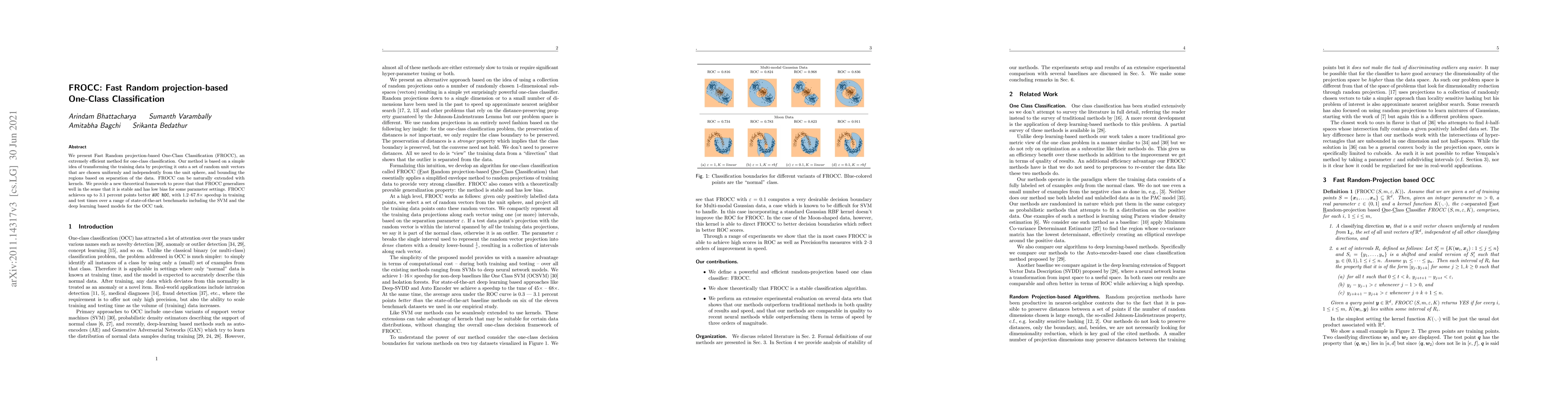 FROCC is an efficient one-class classification method that uses random projections for fast training and testing. The method is theoretically proven to generalize well and outperforms state-of-the-art benchmarks by up to 3.1 percent points in ROC, with significant speedups.