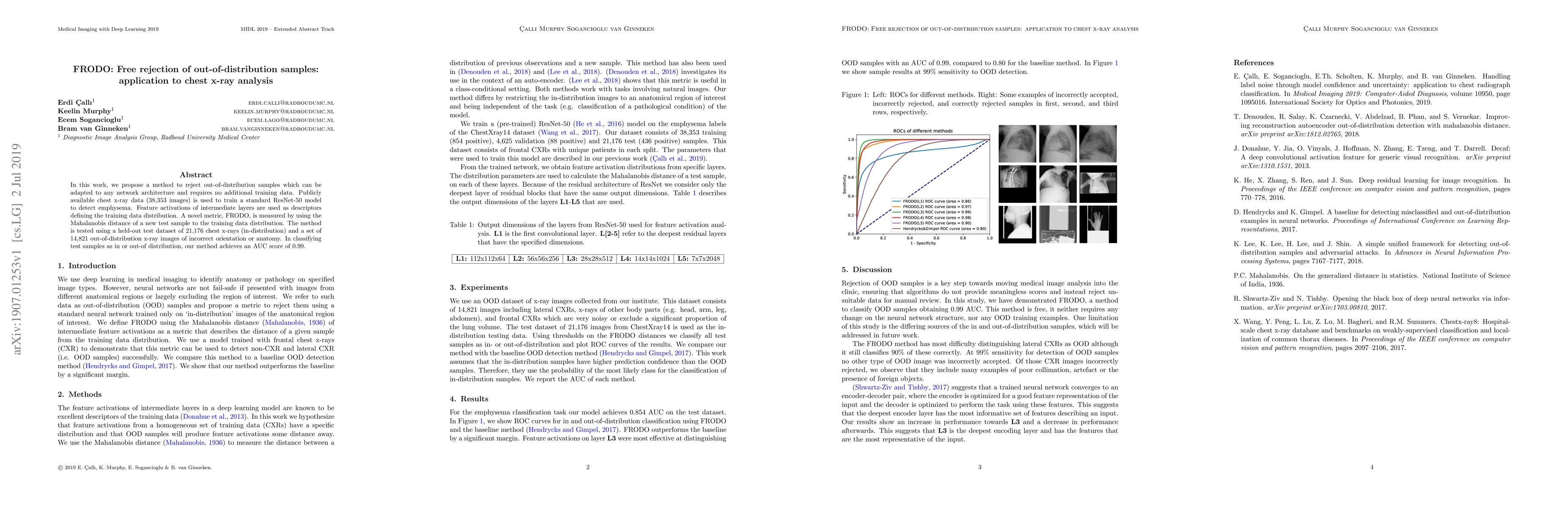 This paper introduces FRODO, a method for rejecting out-of-distribution samples applicable to any network architecture without extra training data. Using a ResNet-50 model trained on chest x-rays to detect emphysema, FRODO measures Mahalanobis distance to assess sample distribution. Tested on a large dataset, FRODO achieves an impressive AUC score of 0.99 in distinguishing in- from out-of-distribution samples.