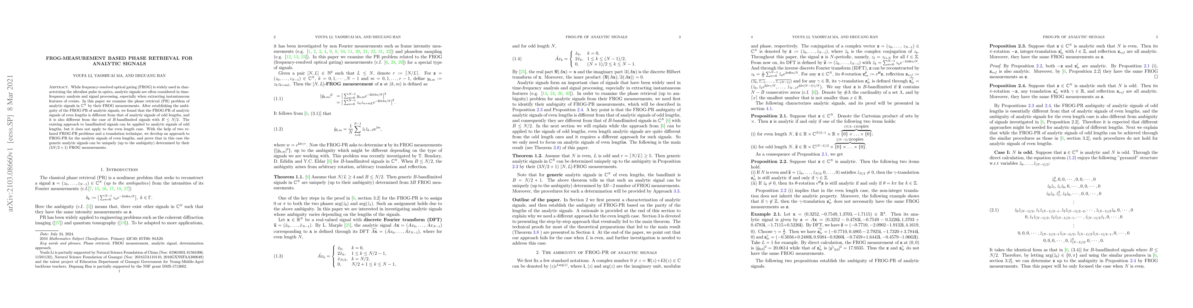 While frequency-resolved optical gating (FROG) is widely used in characterizing the ultrafast pulse in optics, analytic signals are often considered in time-frequency analysis and signal processing, especially when extracting instantaneous features of events. In this paper we examine the phase retrieval (PR) problem of analytic signals in $\Bbb{C}^N$ by their FROG measurements. After establishing the ambiguity of the FROG-PR of analytic signals, we found that the FROG-PR of analytic signals of even lengths is different from that of analytic signals of odd lengths, and it is also different from the case of $B$-bandlimited signals with $B \leq N/2$. The existing approach to bandlimited signals can be applied to analytic signals of odd lengths, but it does not apply to the even length case. With the help of two relaxed FROG-PR problems and a translation technique, we develop an approach to FROG-PR for the analytic signals of even lengths, and prove that in this case the generic analytic signals can be uniquely (up to the ambiguity) determined by their $(3N/2+1)$ FROG measurements.