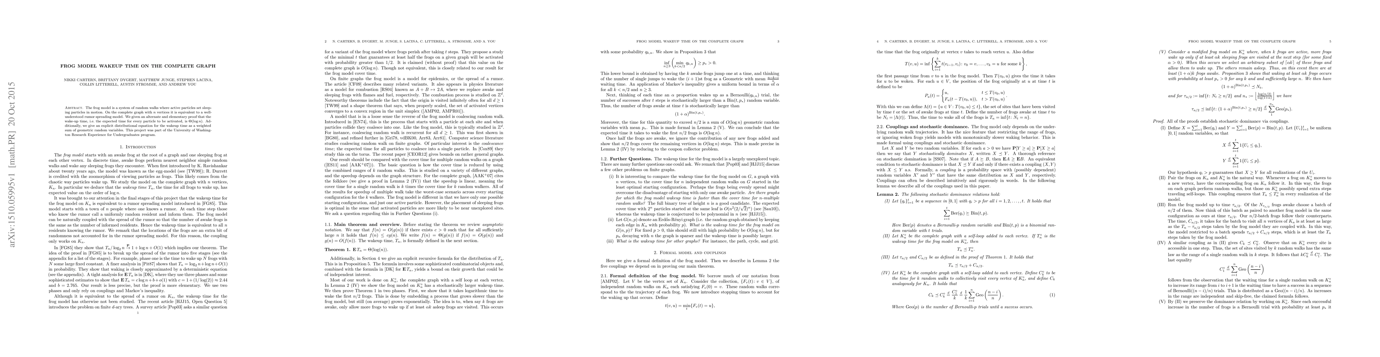 The frog model on a complete graph, which spreads activation like a rumor, has an expected wake-up time of Theta(log n). An elementary proof and an explicit distributional equation for this wakeup time as a weighted sum of geometric random variables are provided.