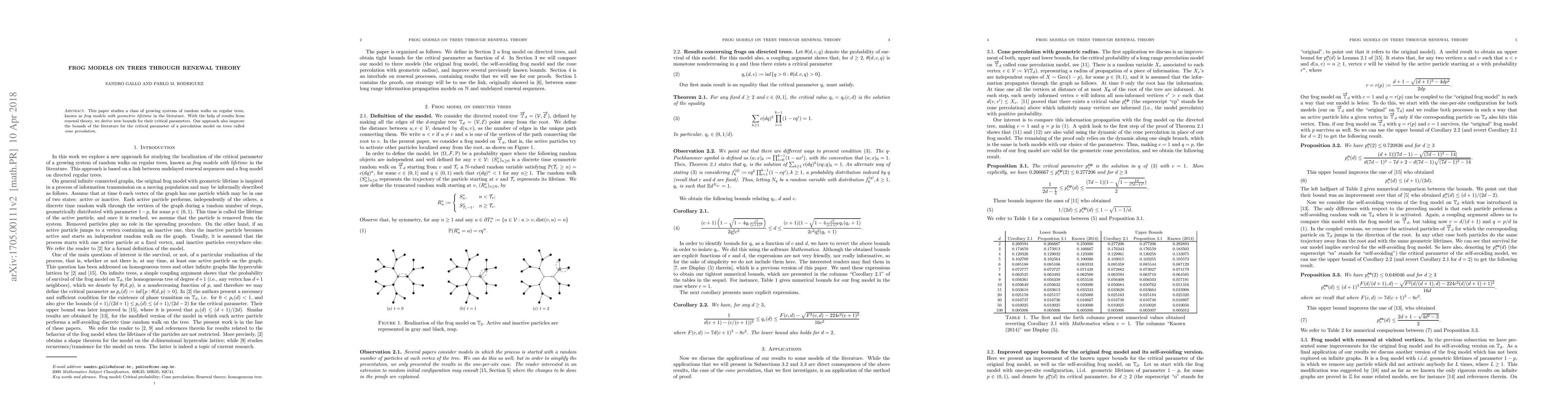 This paper uses renewal theory to derive new bounds for the critical parameters of frog models on trees, a type of growing random walk system, and also improves existing bounds for the critical parameter of cone percolation on trees.
