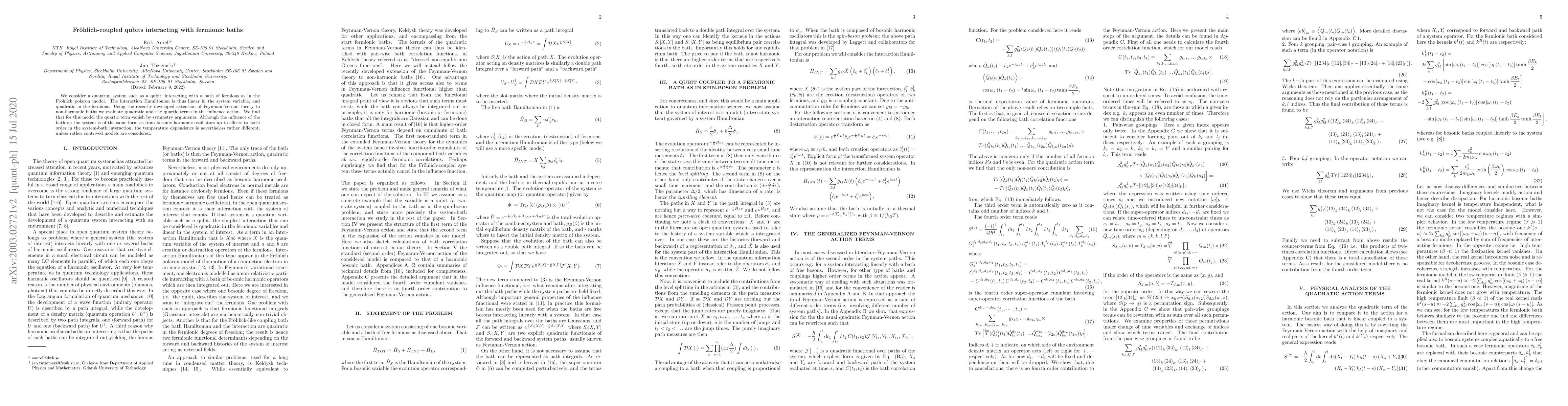 This paper investigates a macroscopic quantum system, specifically a qubit, interacting with fermionic baths in the context of the Fröhlich polaron model. The authors employ an extended Feynman-Vernon theory to evaluate the influence action, finding that the quartic term vanishes due to symmetry, and highlight the distinct temperature dependence compared to bosonic systems.