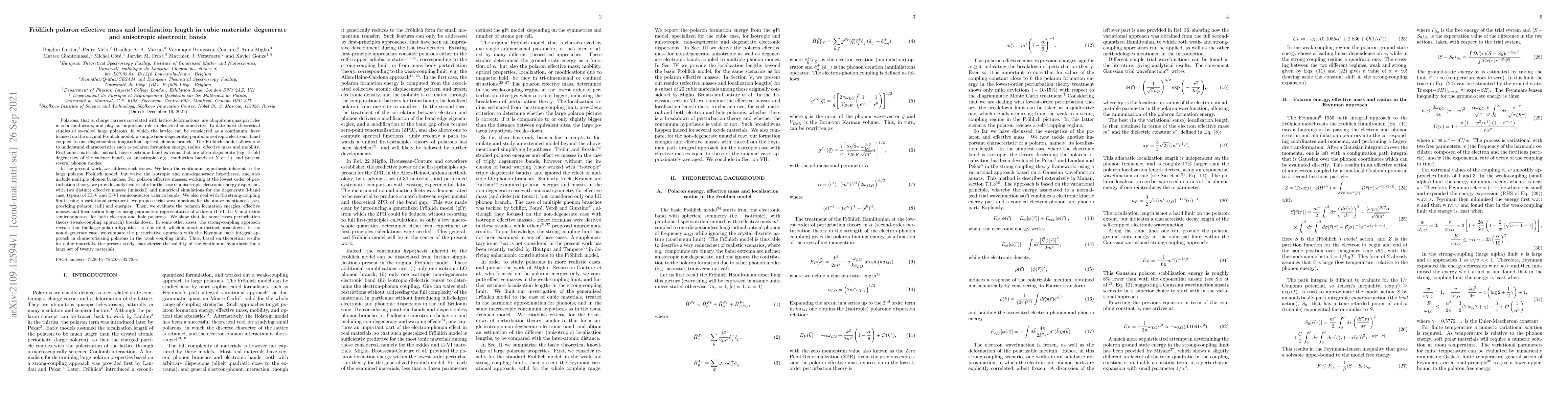 This paper examines the effective mass and localization length of Fröhlich polarons in cubic materials with degenerate and anisotropic electronic bands, extending beyond the traditional parabolic, non-degenerate model. It provides analytical and numerical results for polaron properties, including effective masses and formation energies, and applies variational methods to the strong-coupling regime, comparing approaches in the weak coupling limit.