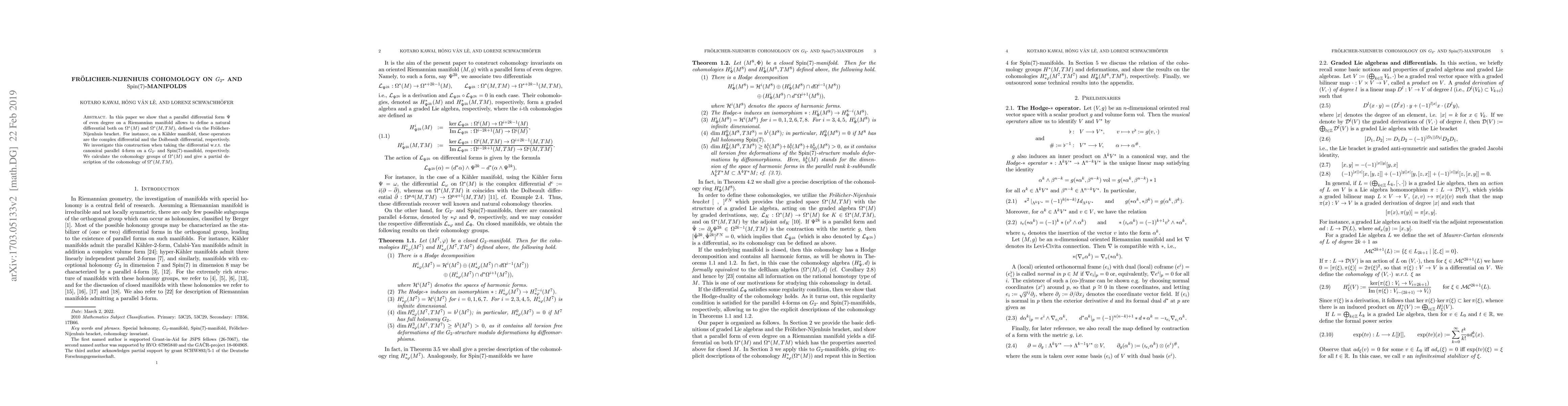 This paper introduces a natural differential defined using the Fr\"olicher-Nijenhuis bracket for parallel differential forms on Riemannian manifolds, specifically on $G_2$ and Spin(7) manifolds. It calculates the cohomology groups of $\Omega^\ast(M)$ and provides a partial description of $\Omega^\ast(M, TM)$ cohomology.