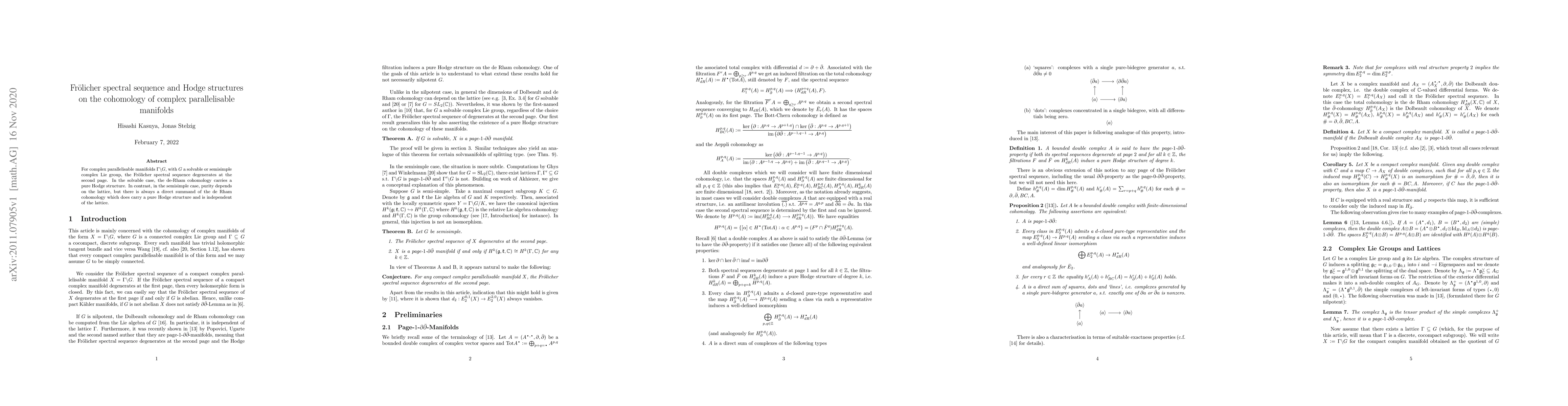 For complex parallelisable manifolds $\Gamma\backslash G$, with $G$ a solvable or semisimple complex Lie group, the Fr\"olicher spectral sequence degenerates at the second page. In the solvable case, the de-Rham cohomology carries a pure Hodge structure. In contrast, in the semisimple case, purity depends on the lattice, but there is always a direct summand of the de Rham cohomology which does carry a pure Hodge structure and is independent of the lattice.