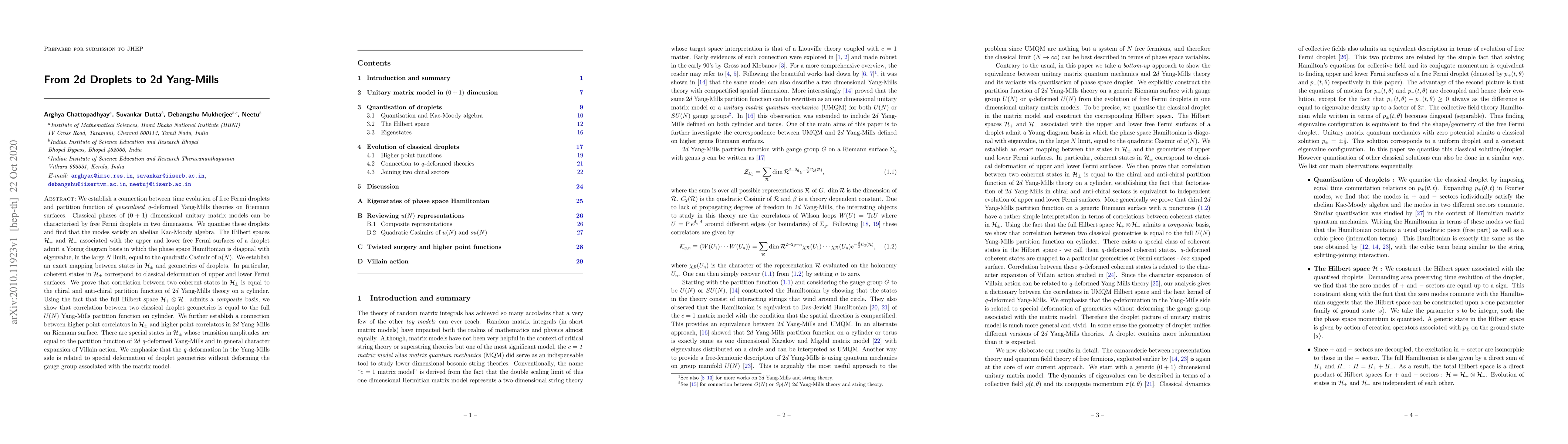 We establish a connection between time evolution of free Fermi droplets and partition function of \emph{generalised} \emph{q}-deformed Yang-Mills theories on Riemann surfaces. Classical phases of $(0+1)$ dimensional unitary matrix models can be characterised by free Fermi droplets in two dimensions. We quantise these droplets and find that the modes satisfy an abelian Kac-Moody algebra. The Hilbert spaces $\mathcal{H}_+$ and $\mathcal{H}_-$ associated with the upper and lower free Fermi surfaces of a droplet admit a Young diagram basis in which the phase space Hamiltonian is diagonal with eigenvalue, in the large $N$ limit, equal to the quadratic Casimir of $u(N)$. We establish an exact mapping between states in $\mathcal{H}_\pm$ and geometries of droplets. In particular, coherent states in $\mathcal{H}_\pm$ correspond to classical deformation of upper and lower Fermi surfaces. We prove that correlation between two coherent states in $\mathcal{H}_\pm$ is equal to the chiral and anti-chiral partition function of $2d$ Yang-Mills theory on a cylinder. Using the fact that the full Hilbert space $\mathcal{H}_+ \otimes \mathcal{H}_-$ admits a \emph{composite} basis, we show that correlation between two classical droplet geometries is equal to the full $U(N)$ Yang-Mills partition function on cylinder. We further establish a connection between higher point correlators in $\mathcal{H}_\pm$ and higher point correlators in $2d$ Yang-Mills on Riemann surface. There are special states in $\mathcal{H}_\pm$ whose transition amplitudes are equal to the partition function of $2d$ \emph{q}-deformed Yang-Mills and in general character expansion of Villain action. We emphasise that the \emph{q}-deformation in the Yang-Mills side is related to special deformation of droplet geometries without deforming the gauge group associated with the matrix model.