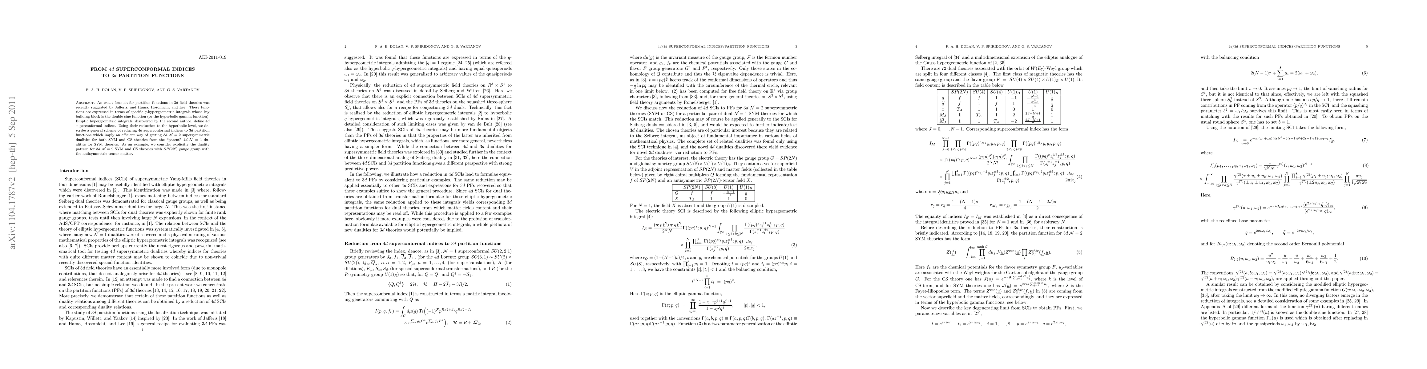 An exact formula for partition functions in 3d field theories was recently suggested by Jafferis, and Hama, Hosomichi, and Lee. These functions are expressed in terms of specific $q$-hypergeometric integrals whose key building block is the double sine function (or the hyperbolic gamma function). Elliptic hypergeometric integrals, discovered by the second author, define 4d superconformal indices. Using their reduction to the hyperbolic level, we describe a general scheme of reducing 4d superconformal indices to 3d partition functions which imply an efficient way of getting 3d $\mathcal{N}=2$ supersymmetric dualities for both SYM and CS theories from the "parent" 4d $\mathcal{N}=1$ dualities for SYM theories. As an example, we consider explicitly the duality pattern for 3d $\mathcal{N}=2$ SYM and CS theories with SP(2N) gauge group with the antisymmetric tensor matter.