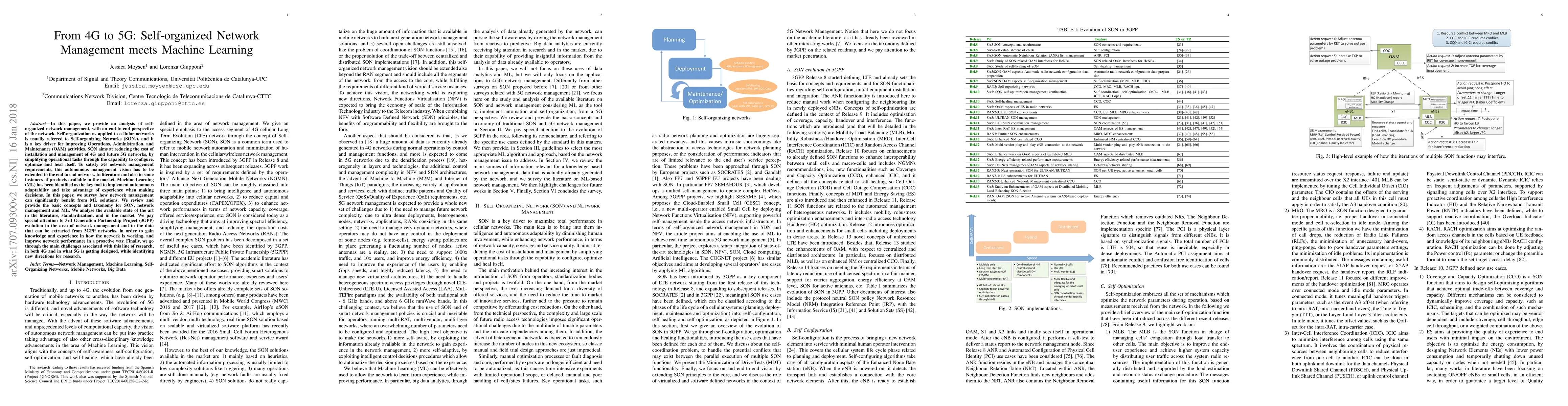 This paper surveys the integration of Machine Learning (ML) in self-organized network management (SON) for 4G and future 5G networks, emphasizing the potential for autonomous adaptability and proactive performance improvement. It highlights the challenges and opportunities in this evolving field, with a focus on 3rd Generation Partnership Project (3GPP) standards and market trends.