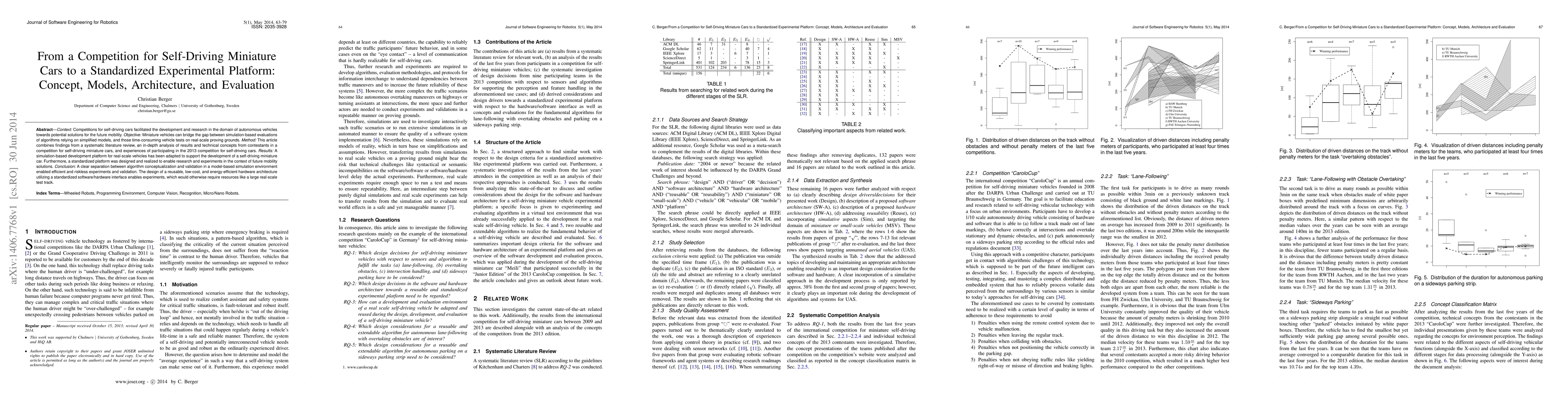 Context: Competitions for self-driving cars facilitated the development and research in the domain of autonomous vehicles towards potential solutions for the future mobility. Objective: Miniature vehicles can bridge the gap between simulation-based evaluations of algorithms relying on simplified models, and those time-consuming vehicle tests on real-scale proving grounds. Method: This article combines findings from a systematic literature review, an in-depth analysis of results and technical concepts from contestants in a competition for self-driving miniature cars, and experiences of participating in the 2013 competition for self-driving cars. Results: A simulation-based development platform for real-scale vehicles has been adapted to support the development of a self-driving miniature car. Furthermore, a standardized platform was designed and realized to enable research and experiments in the context of future mobility solutions. Conclusion: A clear separation between algorithm conceptualization and validation in a model-based simulation environment enabled efficient and riskless experiments and validation. The design of a reusable, low-cost, and energy-efficient hardware architecture utilizing a standardized software/hardware interface enables experiments, which would otherwise require resources like a large real-scale test track.
