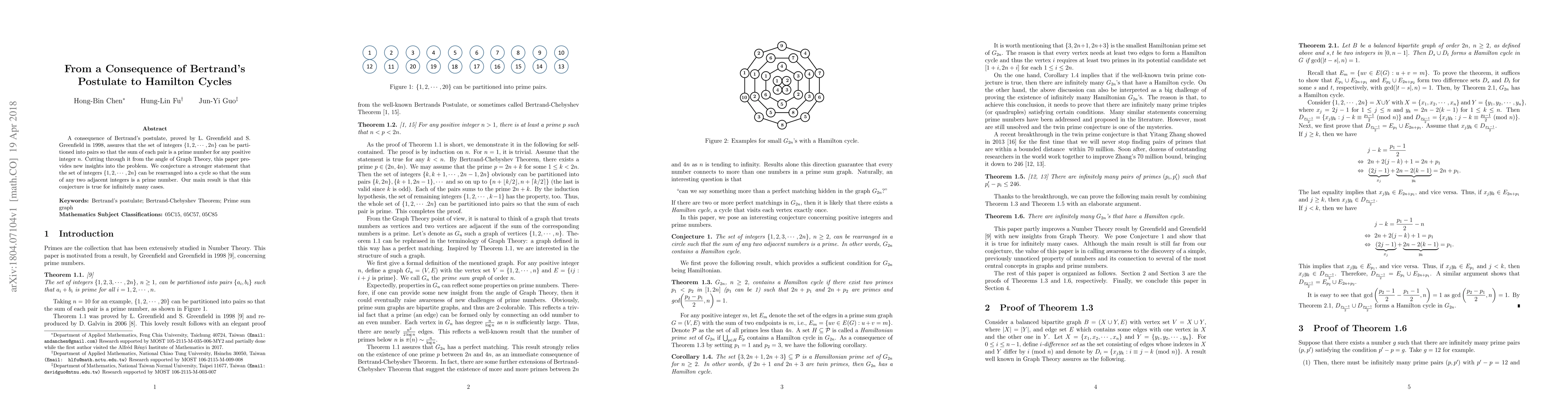 A consequence of Bertrand's postulate, proved by L. Greenfield and S. Greenfield in 1998, assures that the set of integers $\{1,2,\cdots, 2n\}$ can be partitioned into pairs so that the sum of each pair is a prime number for any positive integer $n$. Cutting through it from the angle of Graph Theory, this paper provides new insights into the problem. We conjecture a stronger statement that the set of integers $\{1,2,\cdots, 2n\}$ can be rearranged into a cycle so that the sum of any two adjacent integers is a prime number. Our main result is that this conjecture is true for infinitely many cases.