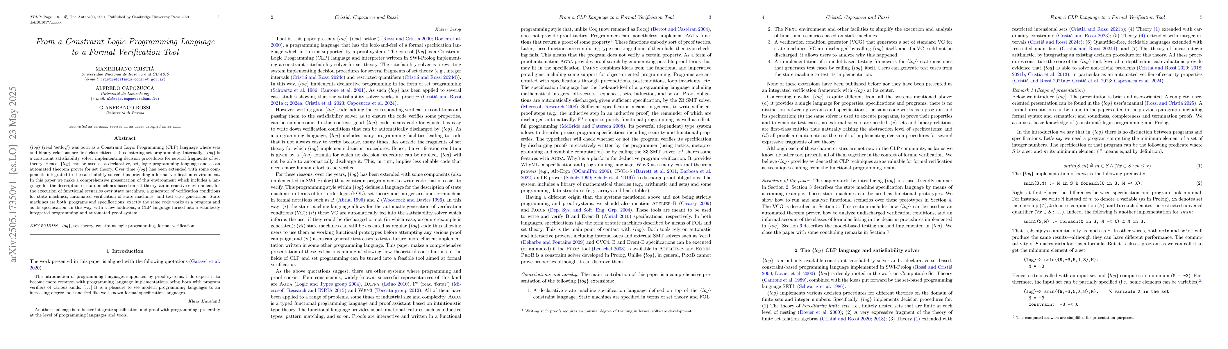 The paper describes the evolution of {log} from a Constraint Logic Programming (CLP) language to a formal verification tool, detailing its internal constraint satisfiability solver and extensions for state machine description, execution, verification condition generation, automated verification, and test case generation.