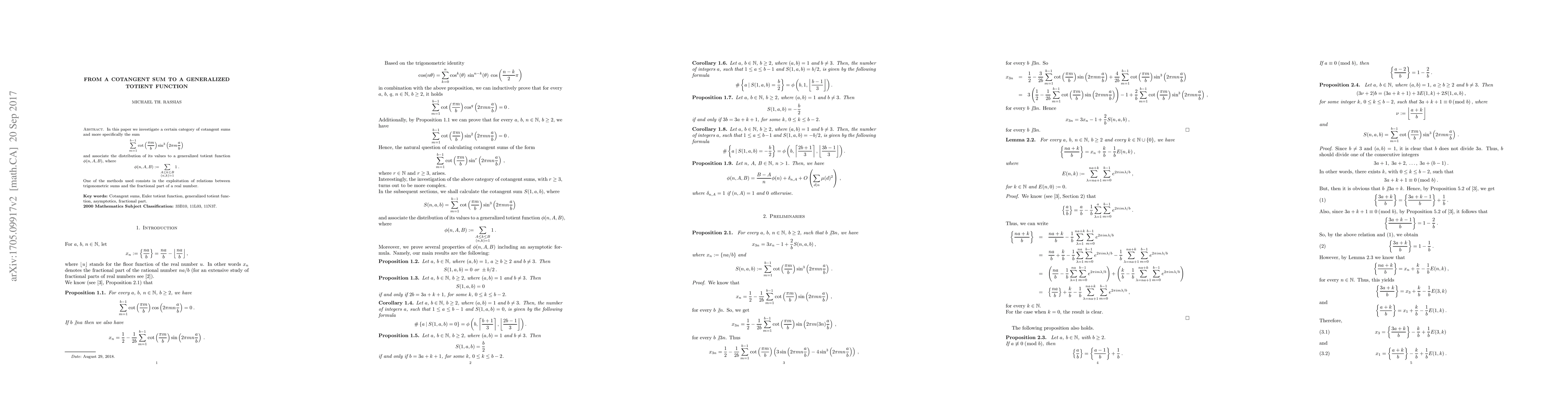 In this paper we investigate a certain category of cotangent sums and more specifically the sum $$\sum_{m=1}^{b-1}\cot\left(\frac{\pi m}{b}\right)\sin^{3}\left(2\pi m\frac{a}{b}\right)\:$$ and associate the distribution of its values to a generalized totient function $\phi(n,A,B)$, where $$\phi(n,A,B):=\sum_{\substack{A\leq k \leq B \\ (n,k)=1}}1\:.$$ One of the methods used consists in the exploitation of relations between trigonometric sums and the fractional part of a real number.