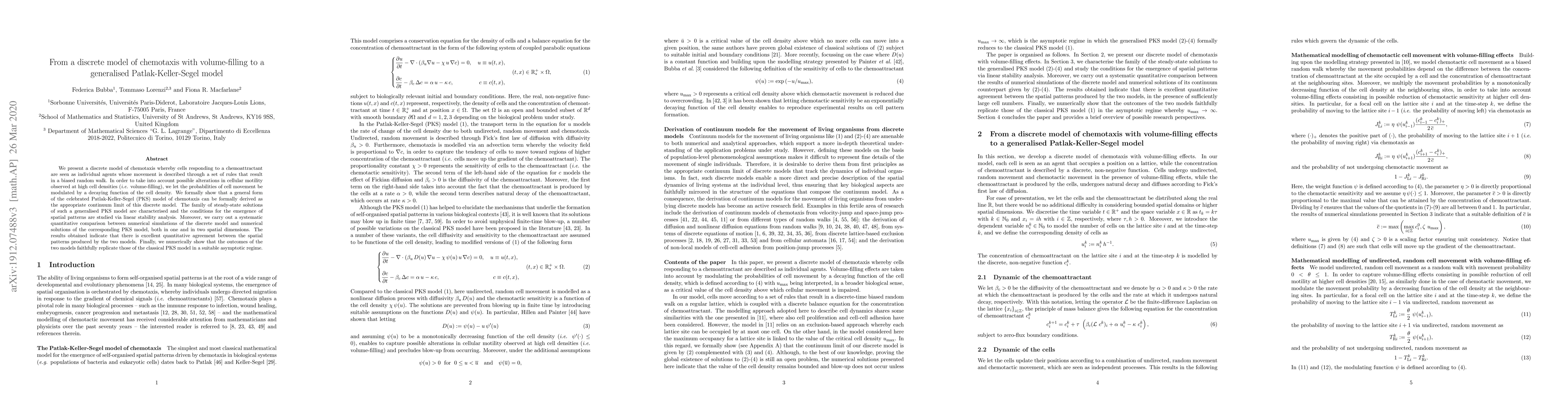 This paper develops a discrete chemotaxis model incorporating volume-filling effects and shows its continuum limit leads to a generalised Patlak-Keller-Segel model. It demonstrates excellent agreement between the spatial patterns of the discrete and generalised PKS models through numerical simulations.