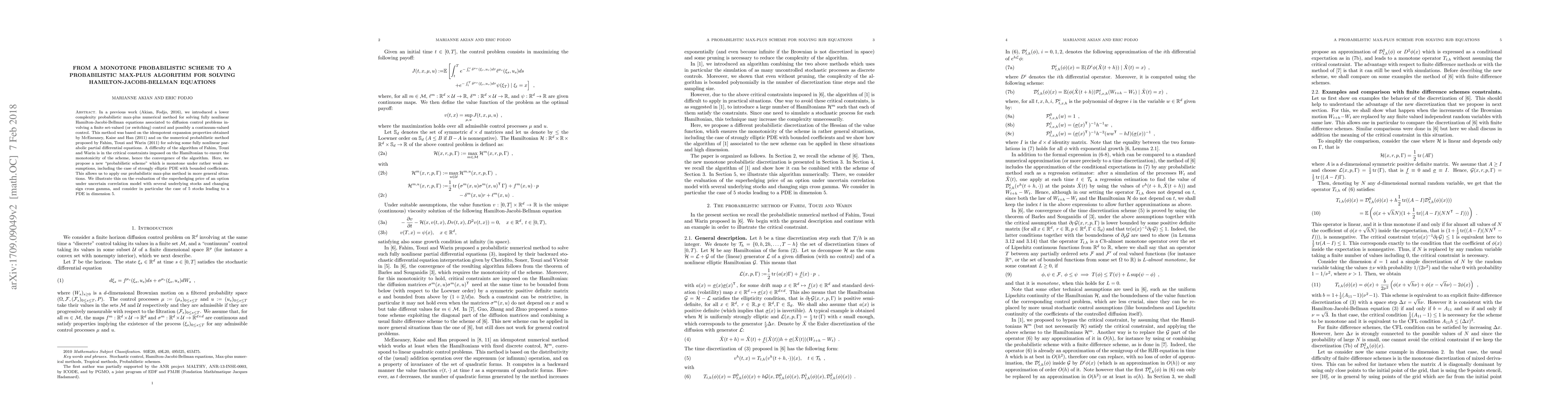 In a previous work (Akian, Fodjo, 2016), we introduced a lower complexity probabilistic max-plus numerical method for solving fully nonlinear Hamilton-Jacobi-Bellman equations associated to diffusion control problems involving a finite set-valued (or switching) control and possibly a continuum-valued control. This method was based on the idempotent expansion properties obtained by McEneaney, Kaise and Han (2011) and on the numerical probabilistic method proposed by Fahim, Touzi and Warin (2011) for solving some fully nonlinear parabolic partial differential equations. A difficulty of the algorithm of Fahim, Touzi and Warin is in the critical constraints imposed on the Hamiltonian to ensure the monotonicity of the scheme, hence the convergence of the algorithm. Here, we propose a new "probabilistic scheme" which is monotone under rather weak assumptions, including the case of strongly elliptic PDE with bounded coefficients. This allows us to apply our probabilistic max-plus method in more general situations. We illustrate this on the evaluation of the superhedging price of an option under uncertain correlation model with several underlying stocks and changing sign cross gamma, and consider in particular the case of 5 stocks leading to a PDE in dimension 5.
