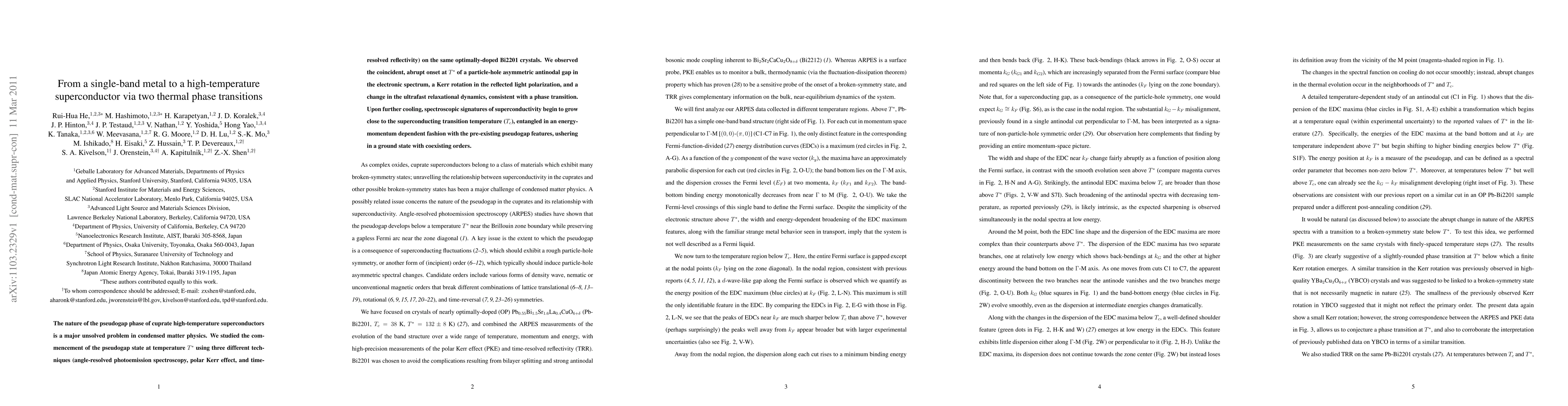 The nature of the pseudogap phase of cuprate high-temperature superconductors is a major unsolved problem in condensed matter physics. We studied the commencement of the pseudogap state at temperature T* using three different techniques (angle-resolved photoemission spectroscopy, polar Kerr effect, and time-resolved reflectivity) on the same optimally-doped Bi2201 crystals. We observed the coincident, abrupt onset at T* of a particle-hole asymmetric antinodal gap in the electronic spectrum, a Kerr rotation in the reflected light polarization, and a change in the ultrafast relaxational dynamics, consistent with a phase transition. Upon further cooling, spectroscopic signatures of superconductivity begin to grow close to the superconducting transition temperature (Tc), entangled in an energy-momentum-dependent fashion with the pre-existing pseudogap features, ushering in a ground state with coexisting orders.